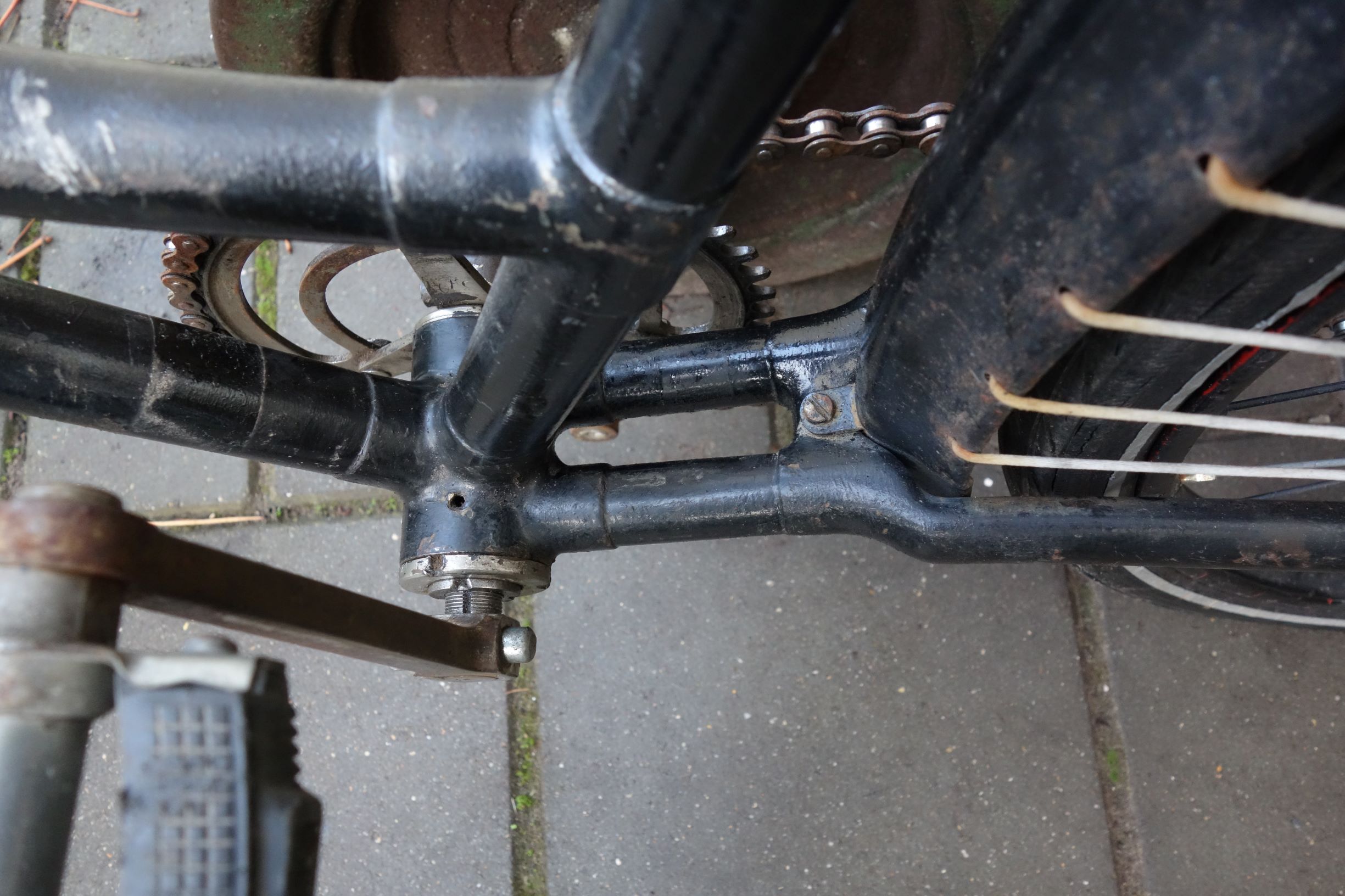 Tijdens de Marktplaats periode en zonder een framenummer te weten was het niet duidelijk wel jaar deze fiets precies was. Dat maakt in de keuze van remsysteem wel veel uit dus. Het 1906 model met de remstangen naar achter is wel gefotografeerd en te vinden in de beeldbank maar daaruit is niet goed op te maken hoe het er allemaal uit ziet. Het 1907 model is veel duidelijker en eenvoudiger ook. Je ziet zelfs waar de bevestigingsbandjes van de kabel zitten. Beetje zwierige loop van die kabel trouwens.