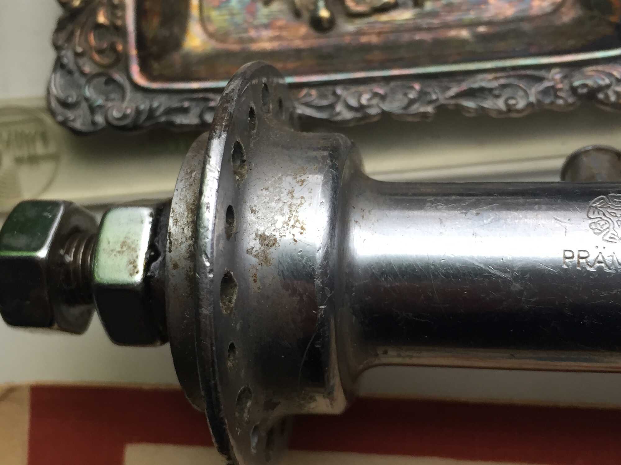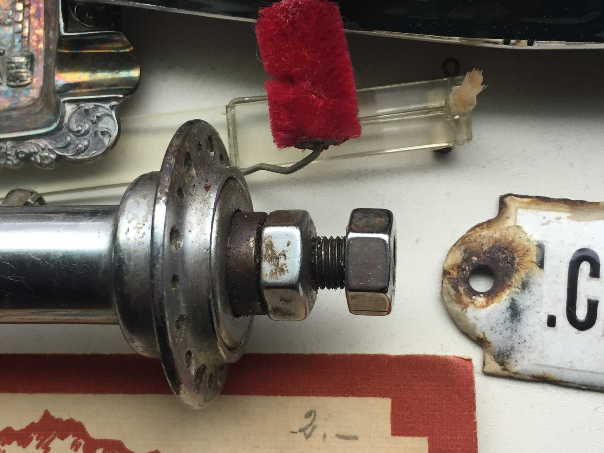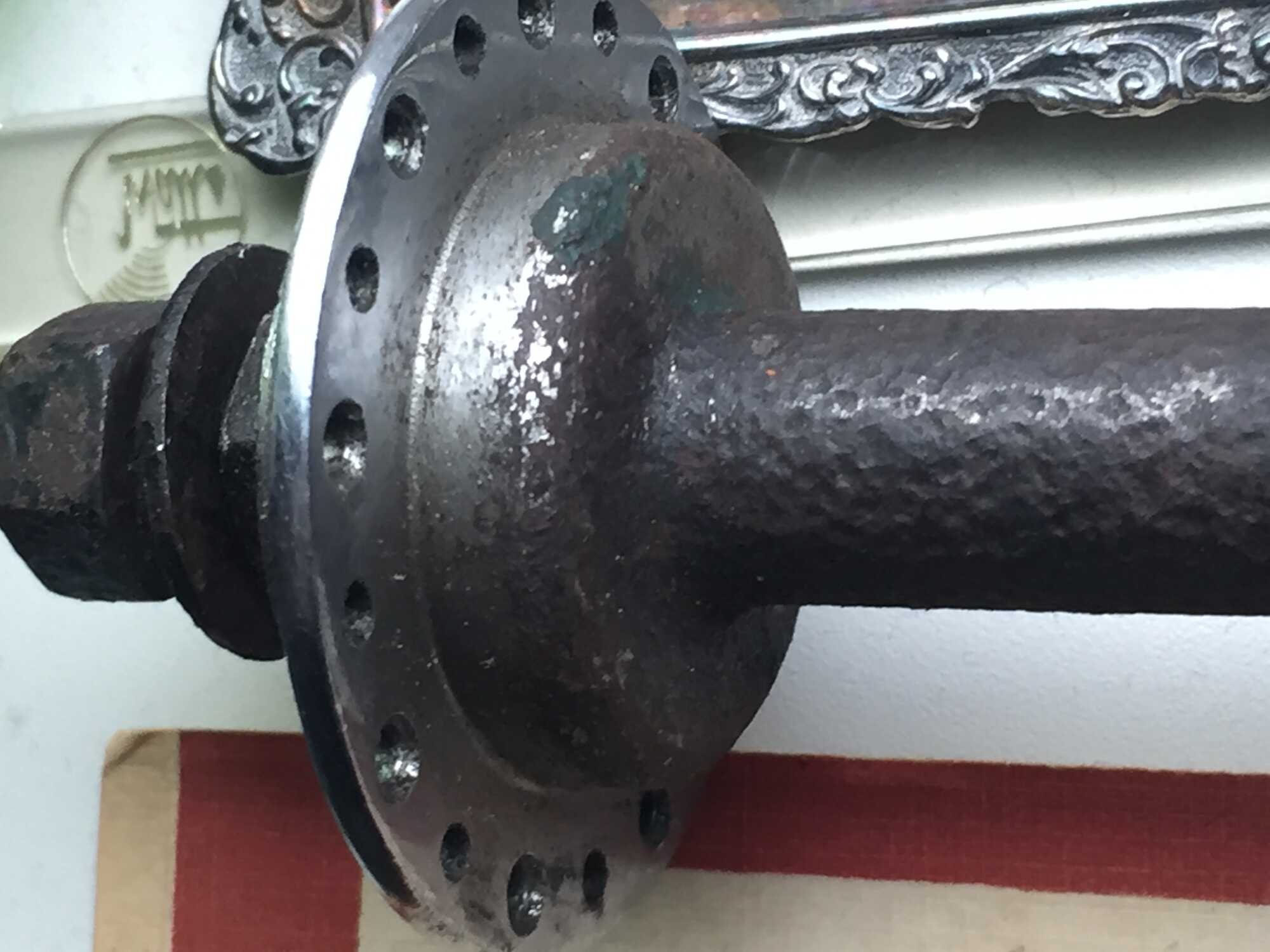 Het chroom op de flensen is een beetje aangetast maar verder nog mooi. De uiteinden van de as zijn ook verchroomd.