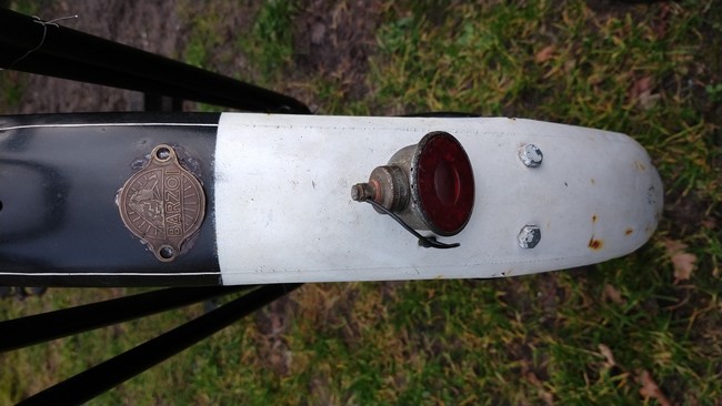 Het embleem zit niet op de originele plaats en hoort oorspronkelijk tussen de spatbordstang boutjes.