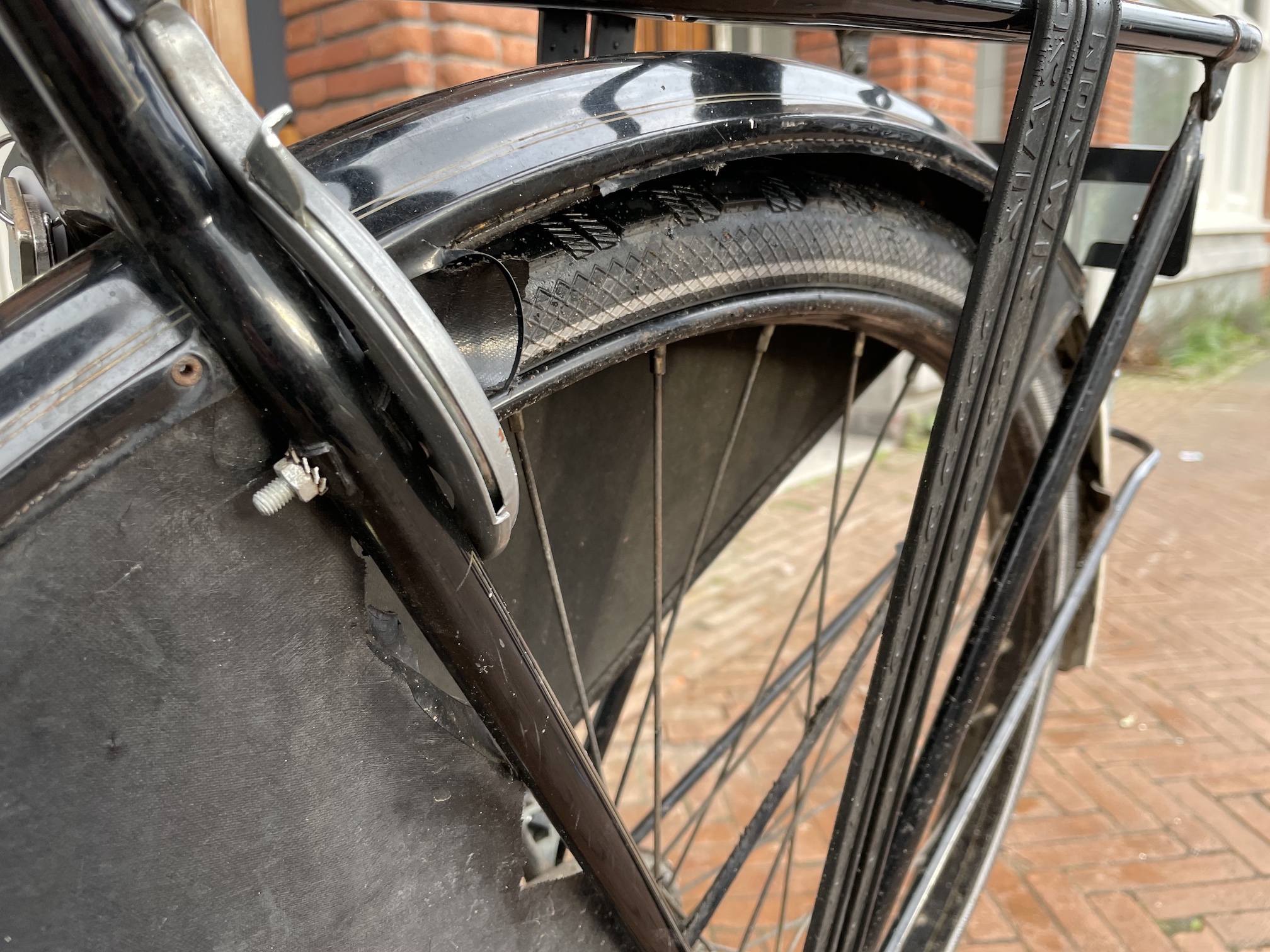 De naven zijn beide Sturmey Archer, met trommelremmen, 3 versnellingen. De velgen hebben beide een enkele bies. Banden: voorop een Vredestein Superior met volledig versleten ribbels voor de dynamo, dus die pakt niet lekker, en achter CST classic breaker, zal wel later erop gezet zijn.