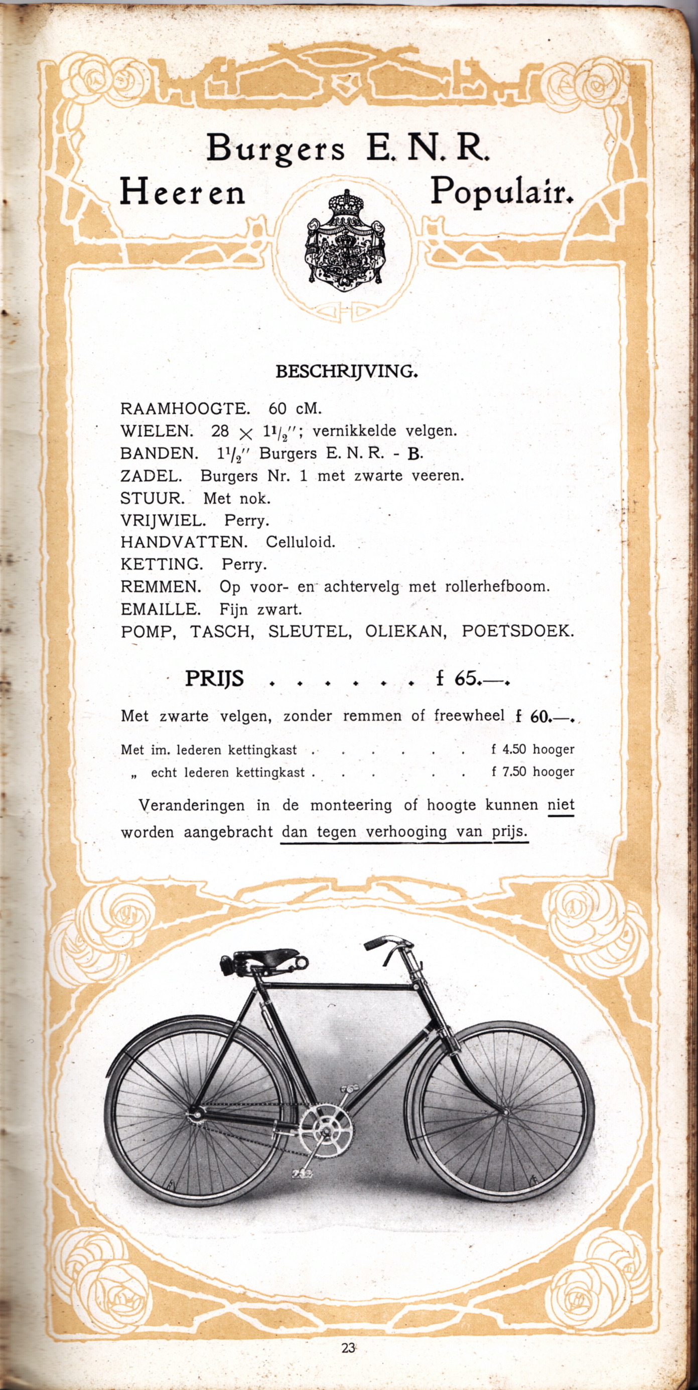 ik heb de Burgers van de 2e foto nog even vergeleken met de catalogus van 1910 (toen gebruikte Burgers het transfer met Marten Kingma). Het is waarschijnlijk model "populair". Dat model heeft het Kettingblad dat Burgers later veel gebruikte. De meeste andere modellen uit dit jaar hebben het vroegere kettingblad met de cirkels . Model populair was in dat jaar het goedkoopste model (65 gulden).