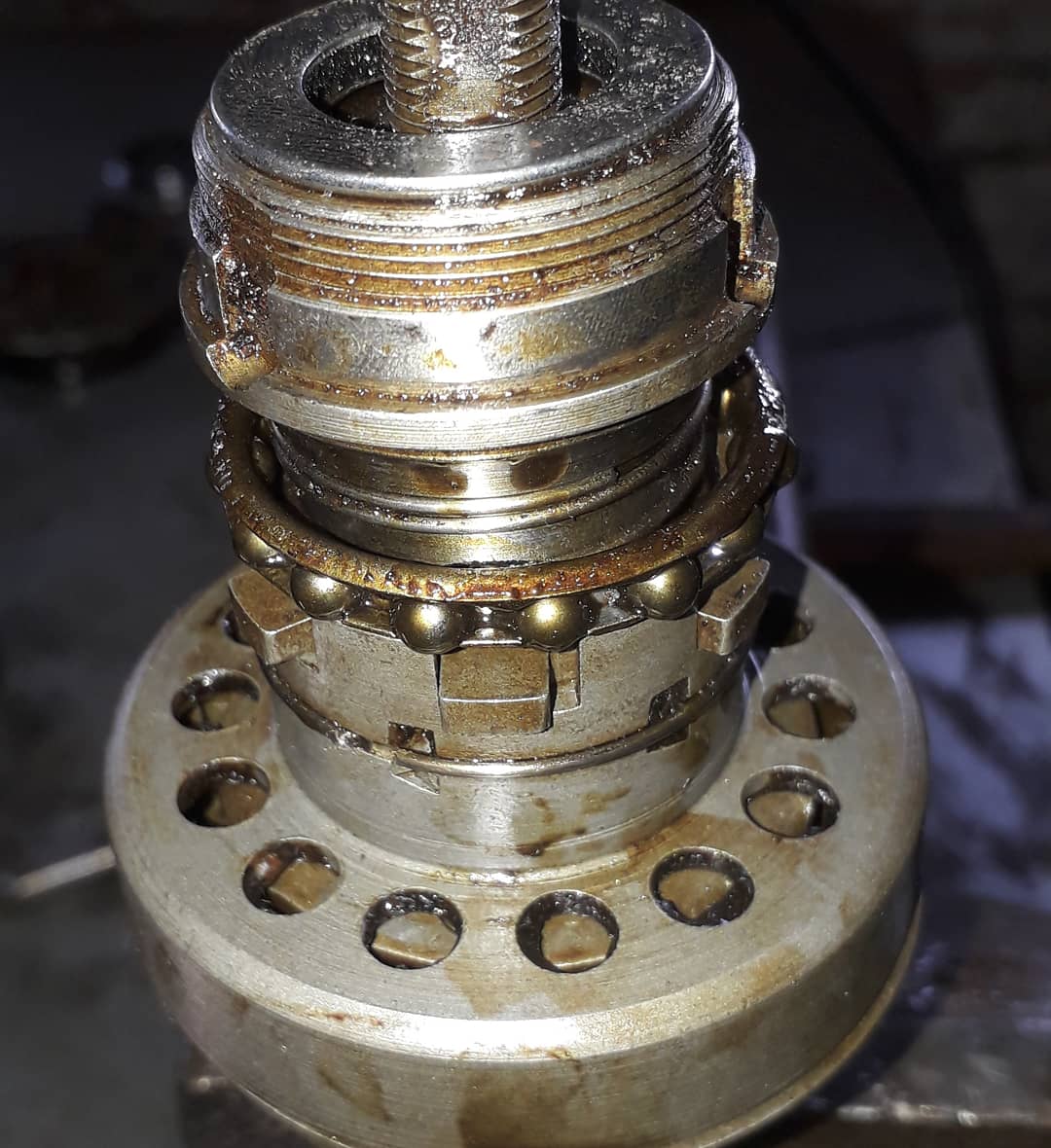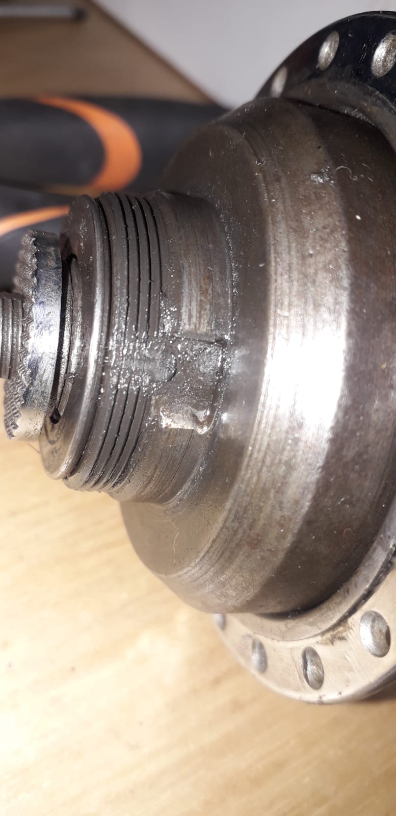 Het lijkt wel of er een tandwiel op moet met nokken in plaats van schroefdraad. Het wordt ook wel 'opsteek tandwiel' genoemd. Het wordt altijd geborgd met een borgveer maar dat lijkt hier dan weer een geschroefde borgring te zijn.