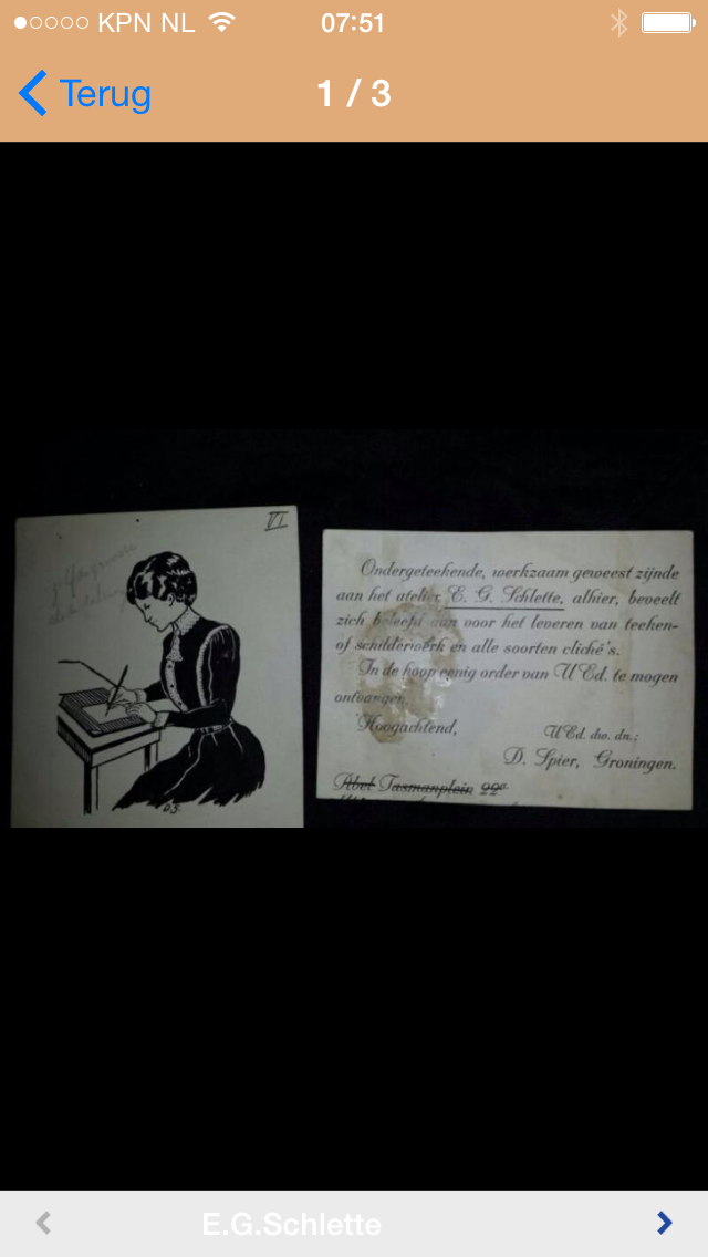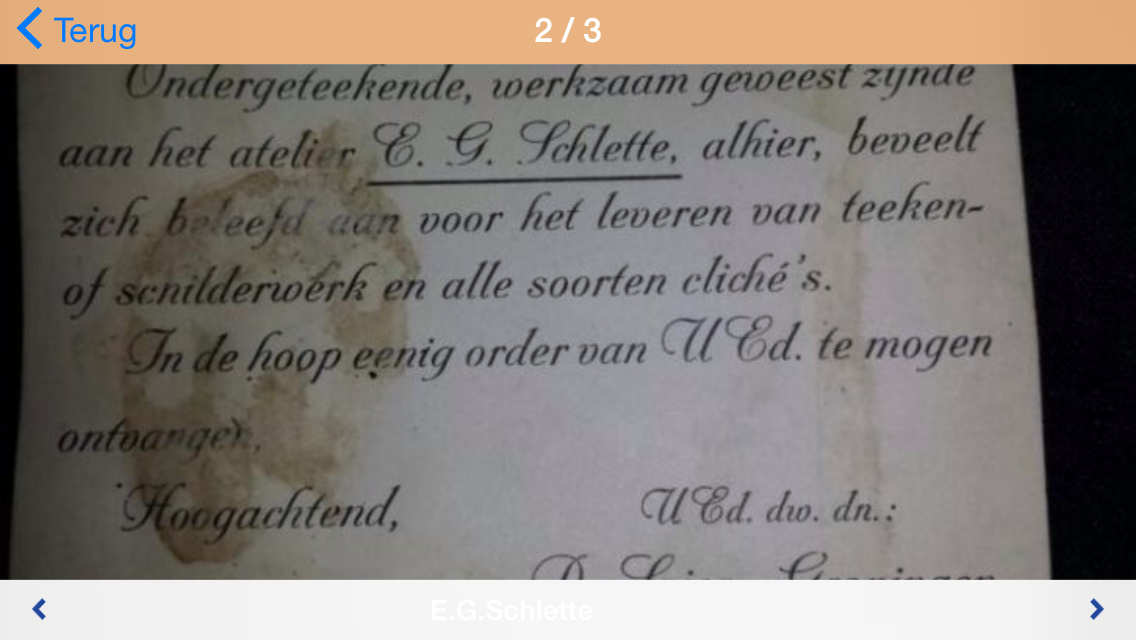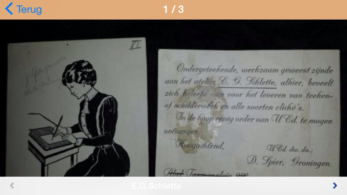 Bij navraag bleek de reclamekaart uit een koffer te komen die bij een huisopruiming van de Paterswoldseweg 43 was gekocht. Op dit adres zat, als ik het mij goed herinner, ook het atelier van E.G. Schlette.