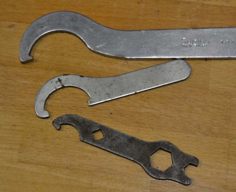 Haaksleutels hebben een beperkt bereik, een bracketsleutel zal wel veel te groot zijn. Boven bracketsleutel, onder 'achternaaf multitool'