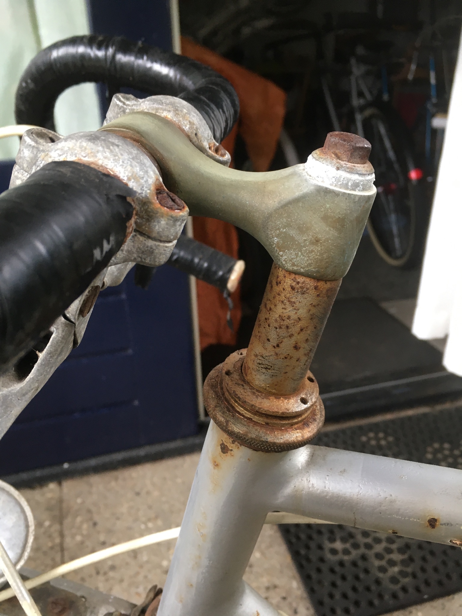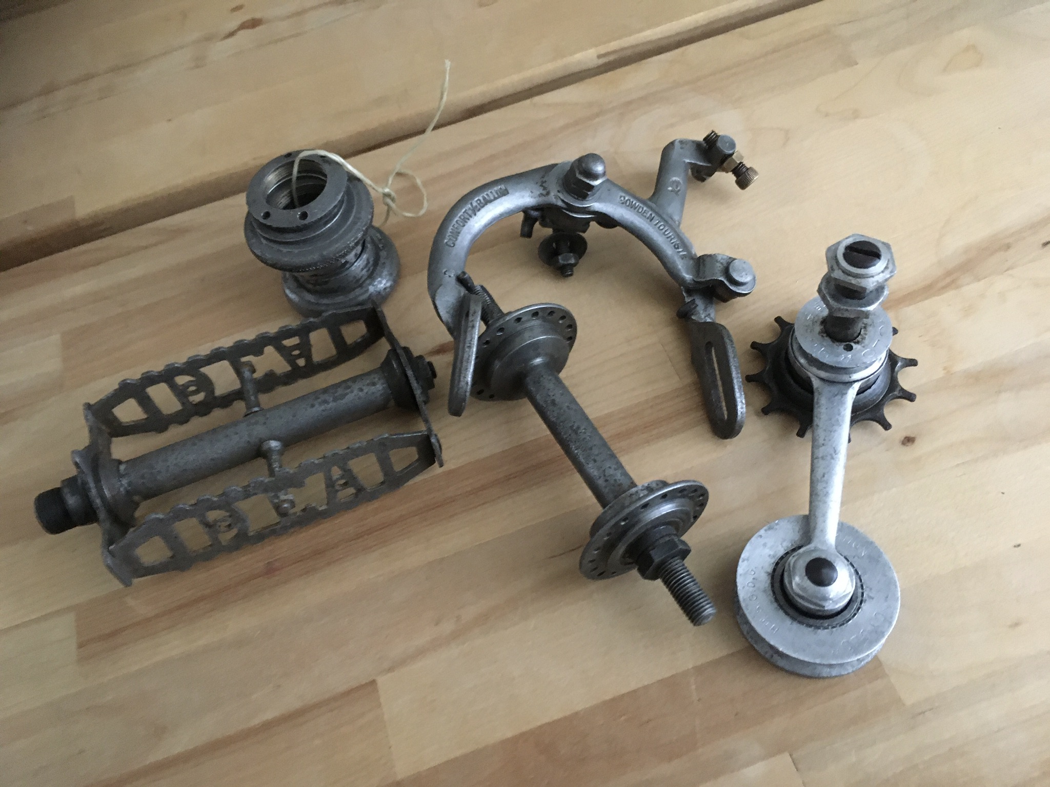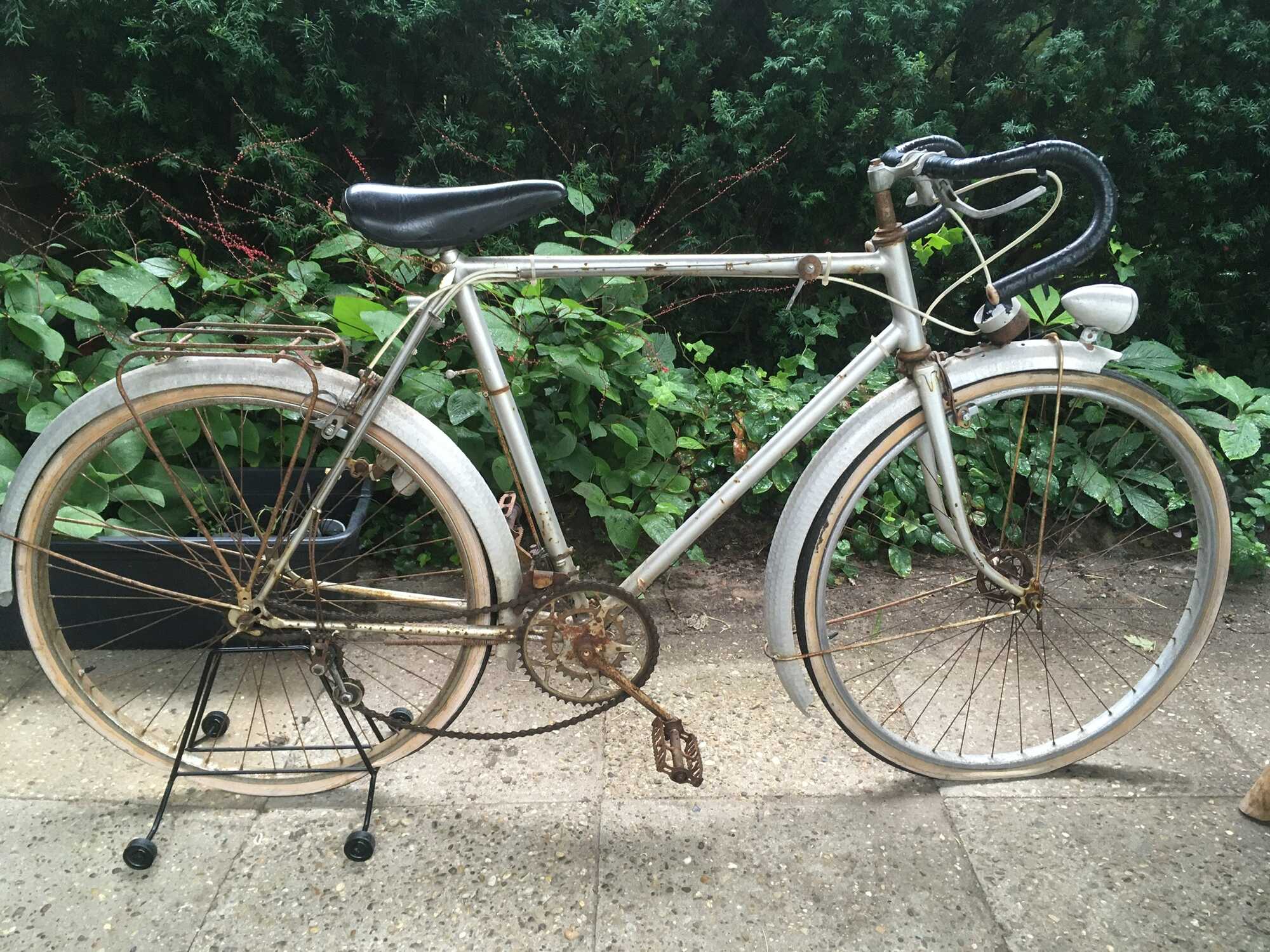 Deze Franse randonneur (Cycles Lacroix meen ik, aan de hand van resten van een transfer) is met hulp van de onderdelen rond 1935 te dateren. Op het zadel na, dat vervangen moet worden, lijkt hij origineel. De fiets ligt helemaal uit elkaar en gaandeweg ben ik bezig de onderdelen uit de roest te halen met de hulp van citroenzuur en staalwol. Ik maak ze bewust niet te nieuw, maar roest wil ik zoveel mogelijk uit het zicht. Dat lukt vrij aardig.