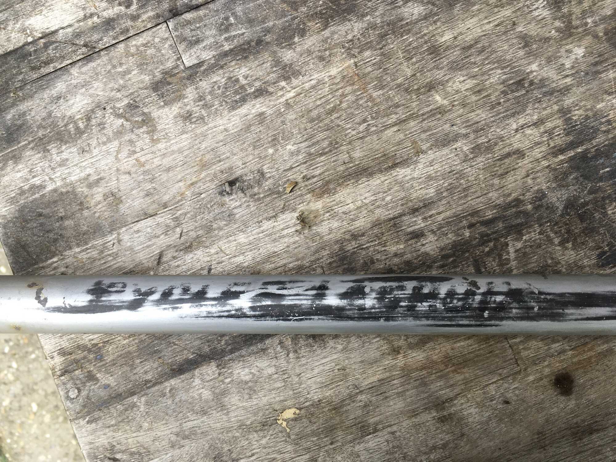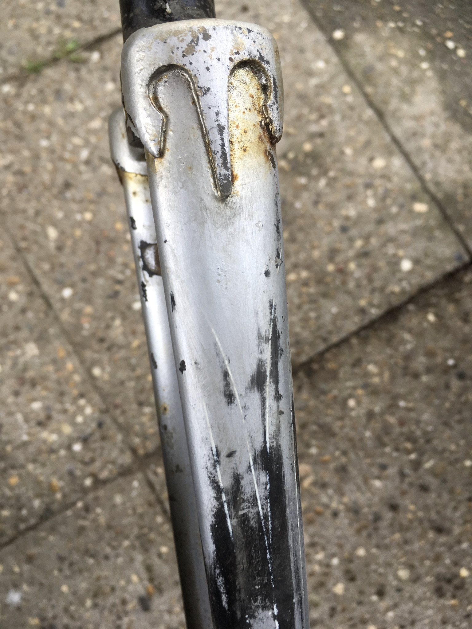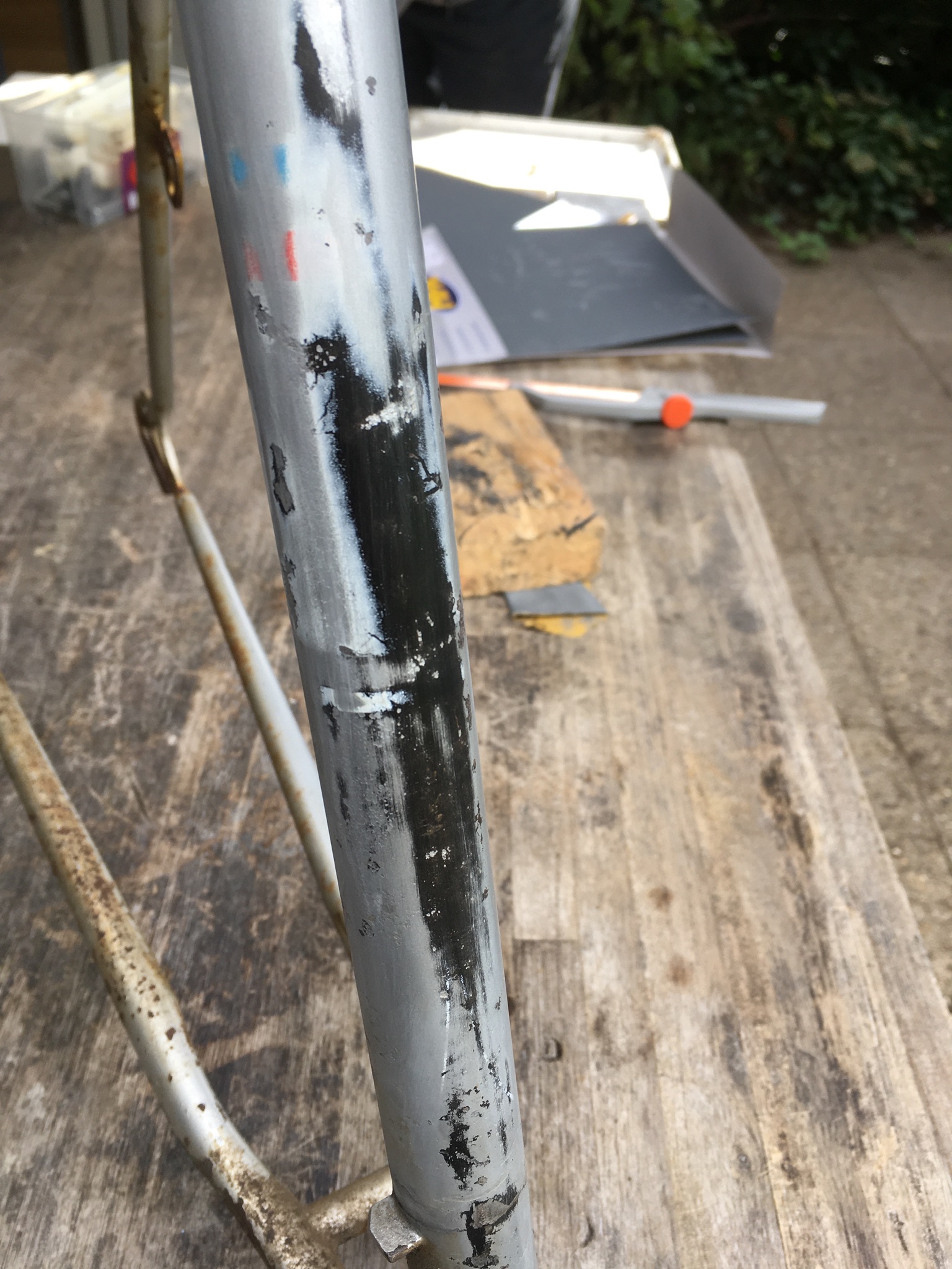 Een vorige eigenaar heeft gemeend het autogeen gelaste frame zilver te moeten kwasten. Die laag zilververf ben ik met veel geduld een het verwijderen, waardoor het lukt het oorspronkelijke witte biezenpatroon te reconstrueren en ook wat resten van een transfer. Tot zover, maar hoe nu verder? Zelfs bij licht schuren om de zwarte lak te voorschijn te toveren lukt het niet de biezen te sparen. Eromheen of erlangs schuren is niet mogelijk, dan blijven er restjes zilververf.