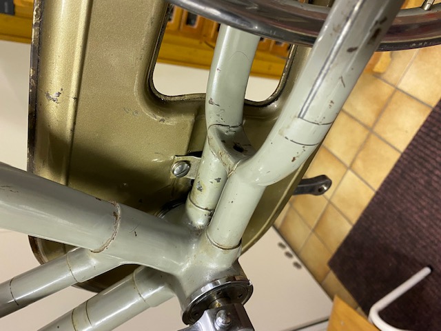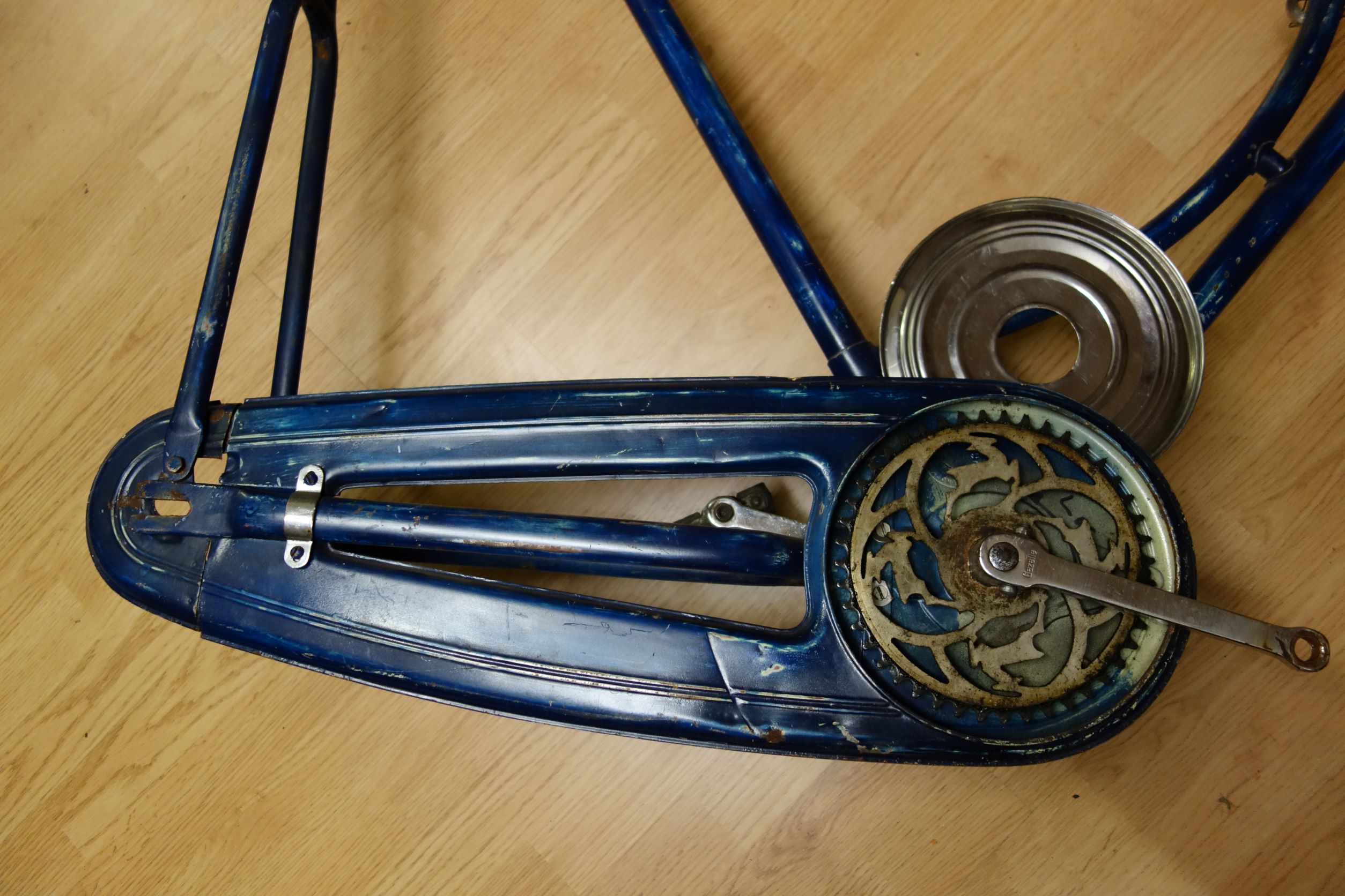De beugel aan de binnenkant komt overeen met de beugels van het frame. Ook zit er aan de achterkant een kap met verticale aansluiting. Dat is denk ik passend voor het model fiets . Aan de binnenkant staat de Speedwell stempel en de kettingkast heeft onder de blauwe verf een lichte fabriekskleur van een revisie bij Gazelle destijds. Deze kast heeft de nodige beschadigingen maar als er gespoten moet worden kunnen die beschadigingen goed weggewerkt worden. Groeten,