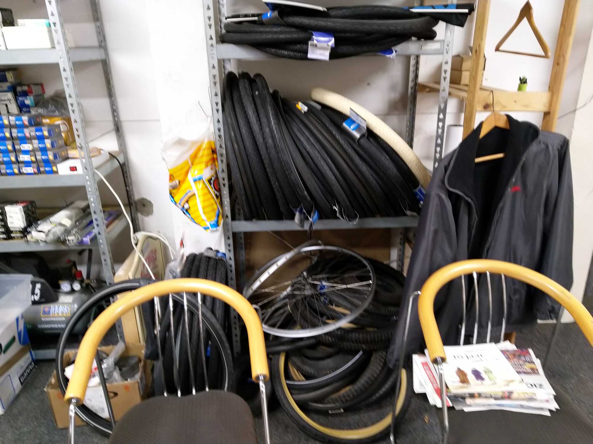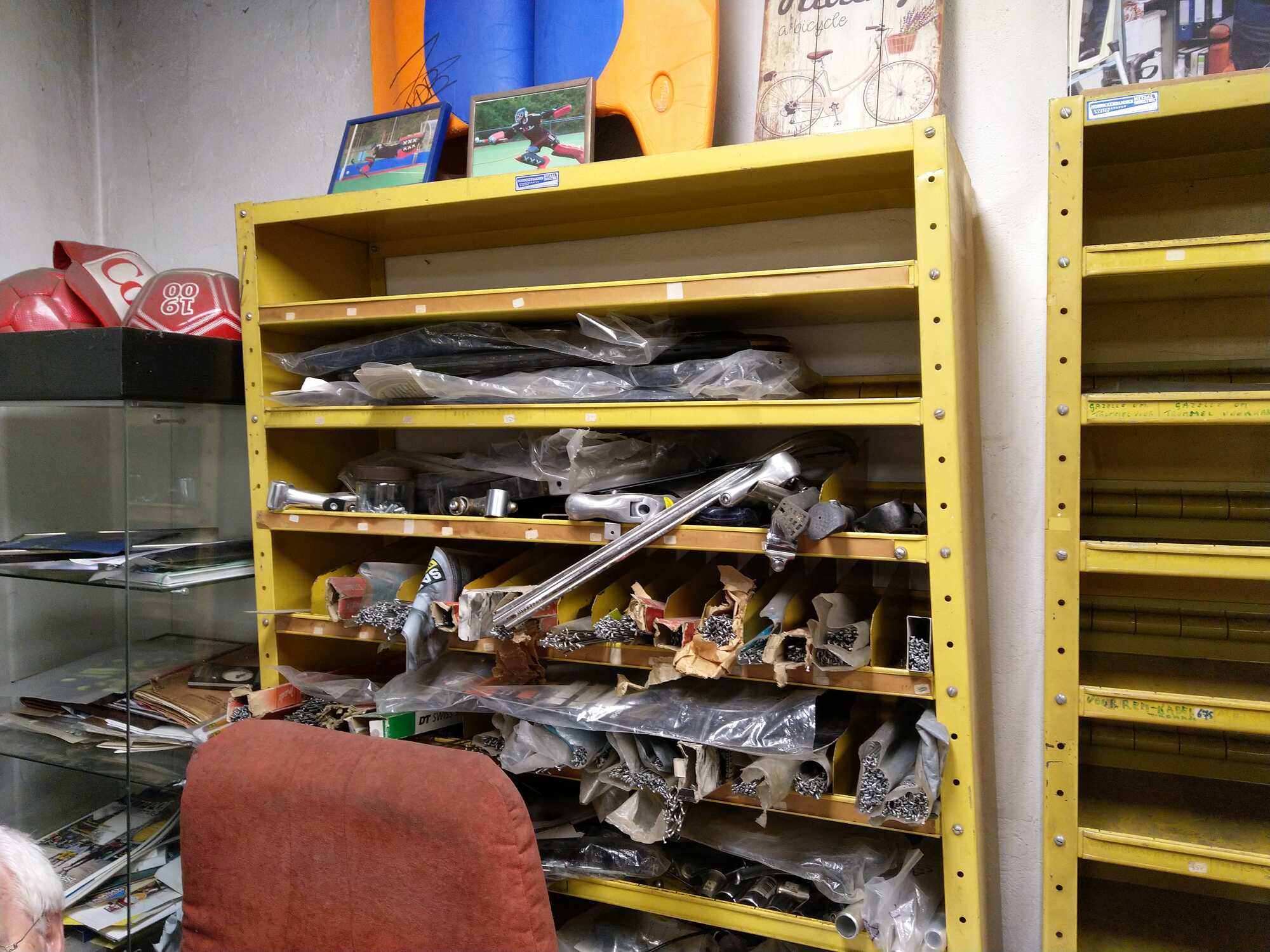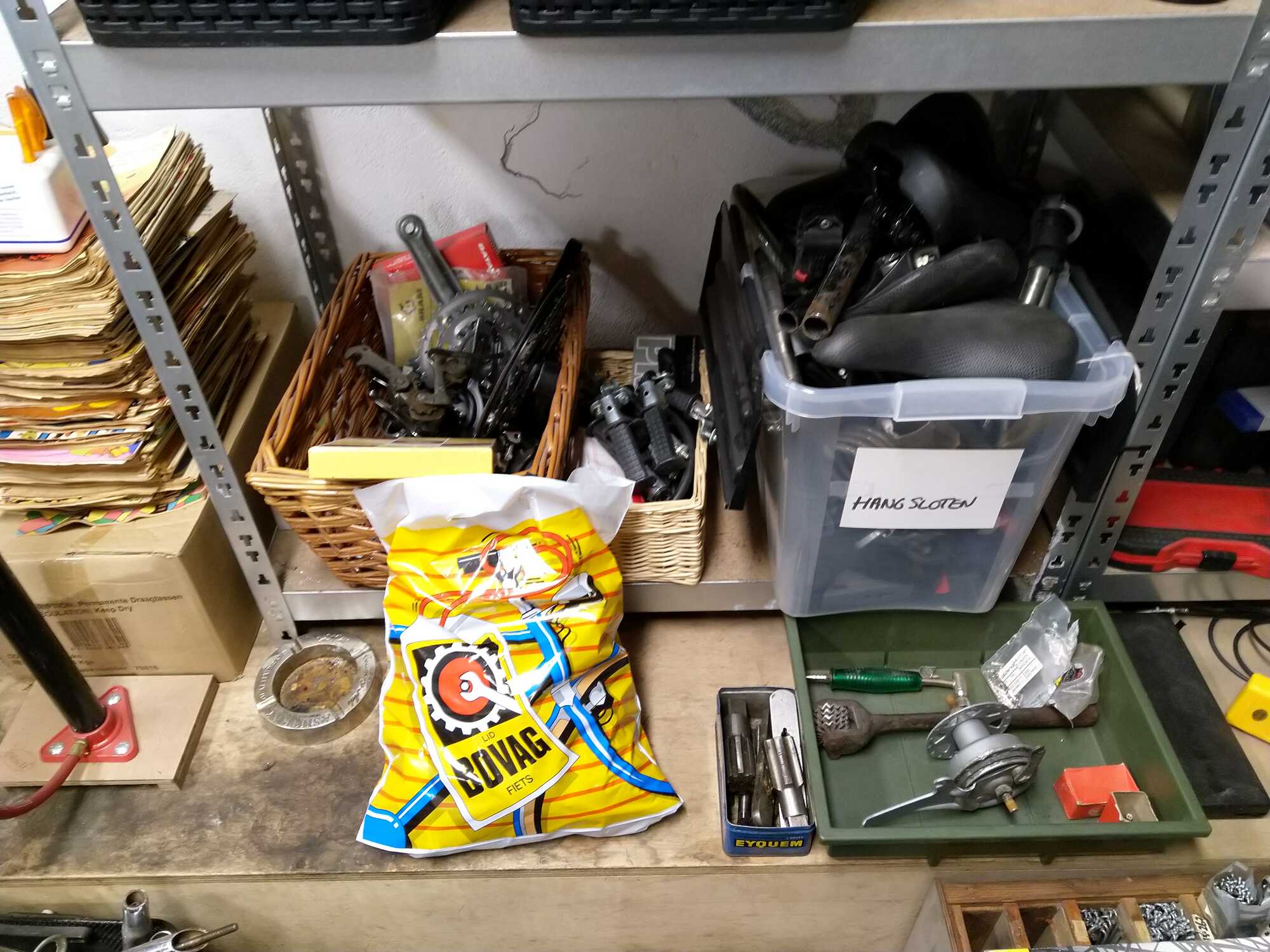 Fietsenmaker Hunting aan de Neuweg 48 te Hilversum stopt met zijn zaak en ruimt zijn werkplaats op; veel is al weg maar er zijn nog wel wat onderdelen en gereedschap waarvoor hij een koper zoekt. Bij belangstelling kun je hem bellen op tel 035-6214572. Hij verstuurt niet, dus je moet het wel komen halen in Hilversum. Hierbij wat foto's die ik hedenmorgen heb gemaakt: