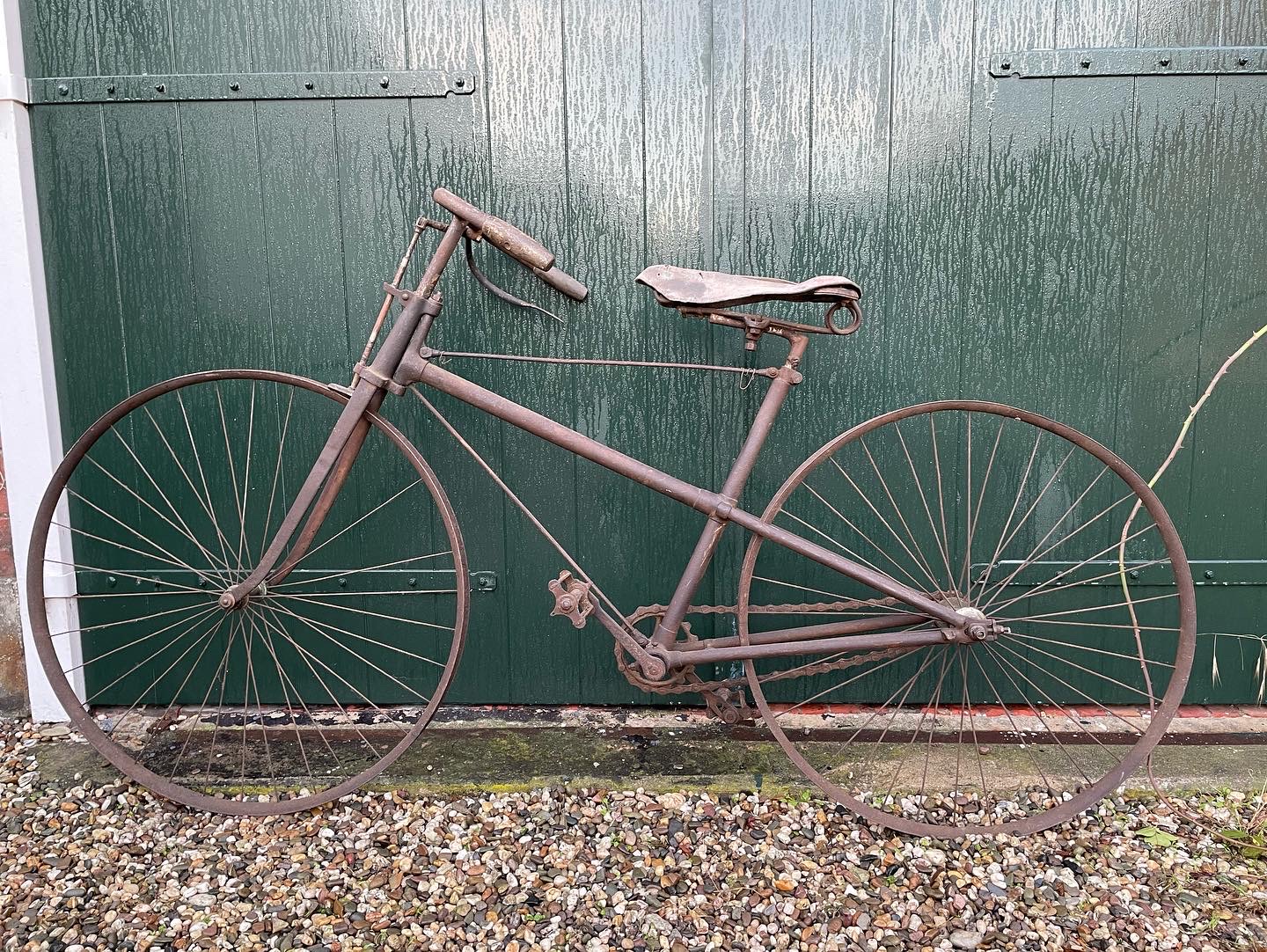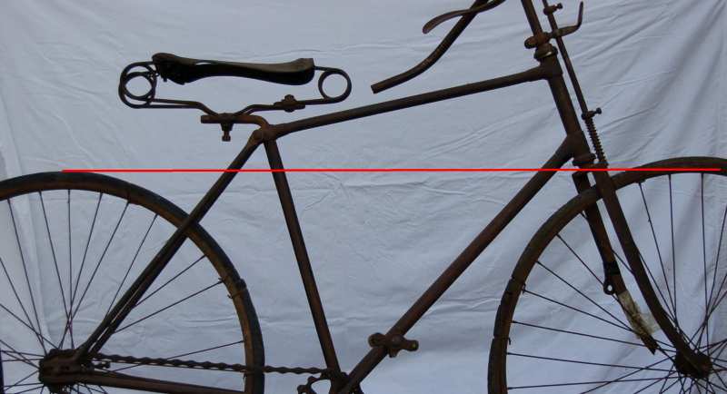 Het voorwiel is meestal groter dan achter (rolt beter, hobbelt minder, en bij een hoge bi was dat immers ook zo (en de zit is nog net zo rechtop) ) want je had niet de beperking van een vaste maat luchtband, maar een band die je per meter kocht
