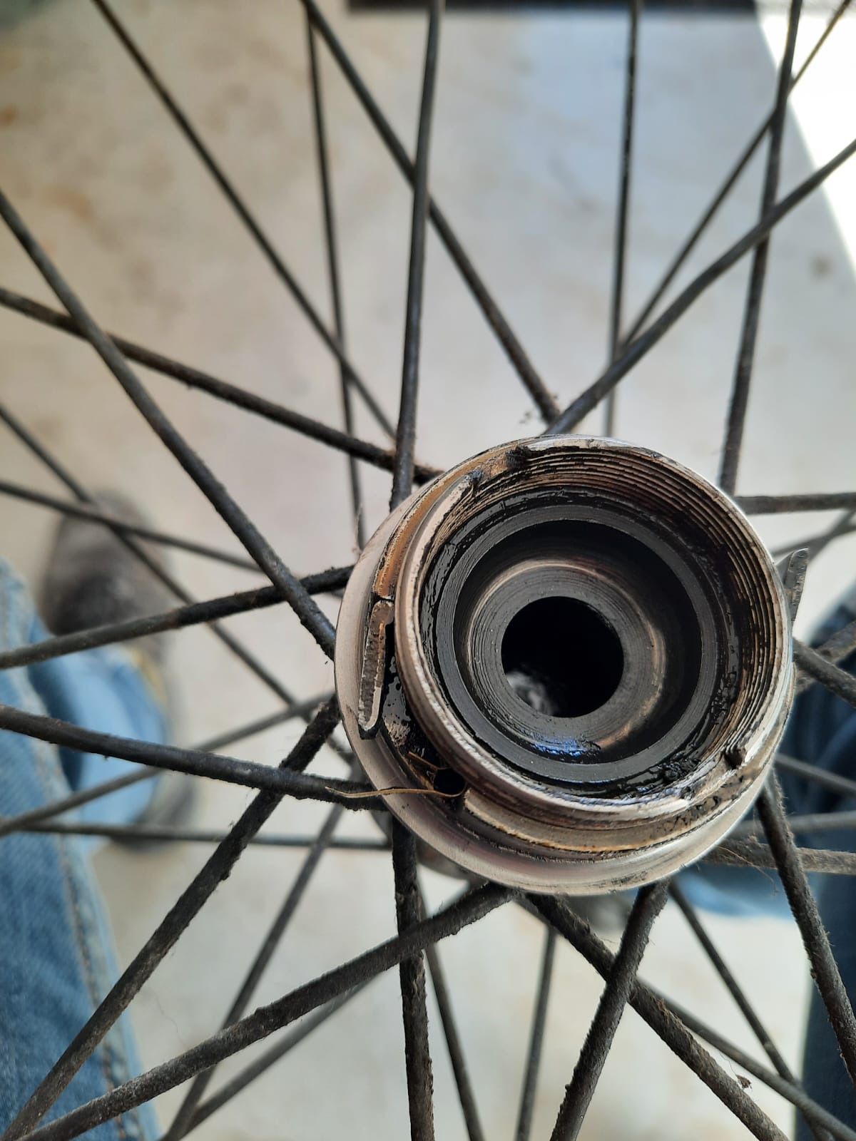 Naar mijn idee heb je het binnenwerk van het freewheel hier nog op de naaf laten zitten. De draad is mijns inziens dus de draad waarmee het complete freewheel op de naaf gemonteerd zit. Overigens aan deze kant zit wel een stofkap van de naaf. Mis je die aan de andere (niet aandrijf)zijde..?