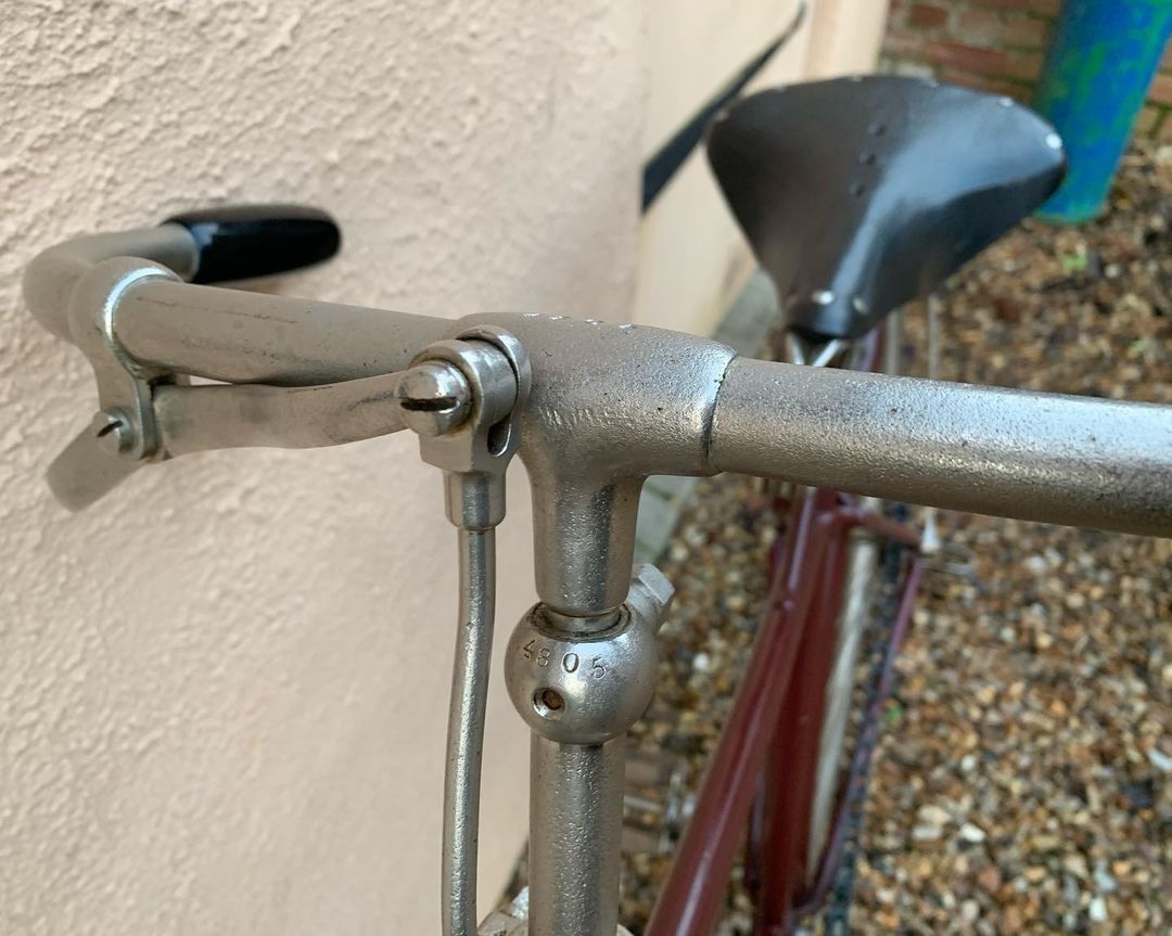 Ik heb nog wat foto` s van de fiets. De eerdere foto`s zijn wat blauw van aard door een verkeerde camera instelling (veel te veel instelmogelijkheden, lijkt leuk maar is vaak ook vervelend). Het tandwiel met de dubbele vertanding is een ding wat ook Premier toepaste. Bij slijtage kan je de ketting een tand verder zetten en heb je weer een als nieuw tandwiel.