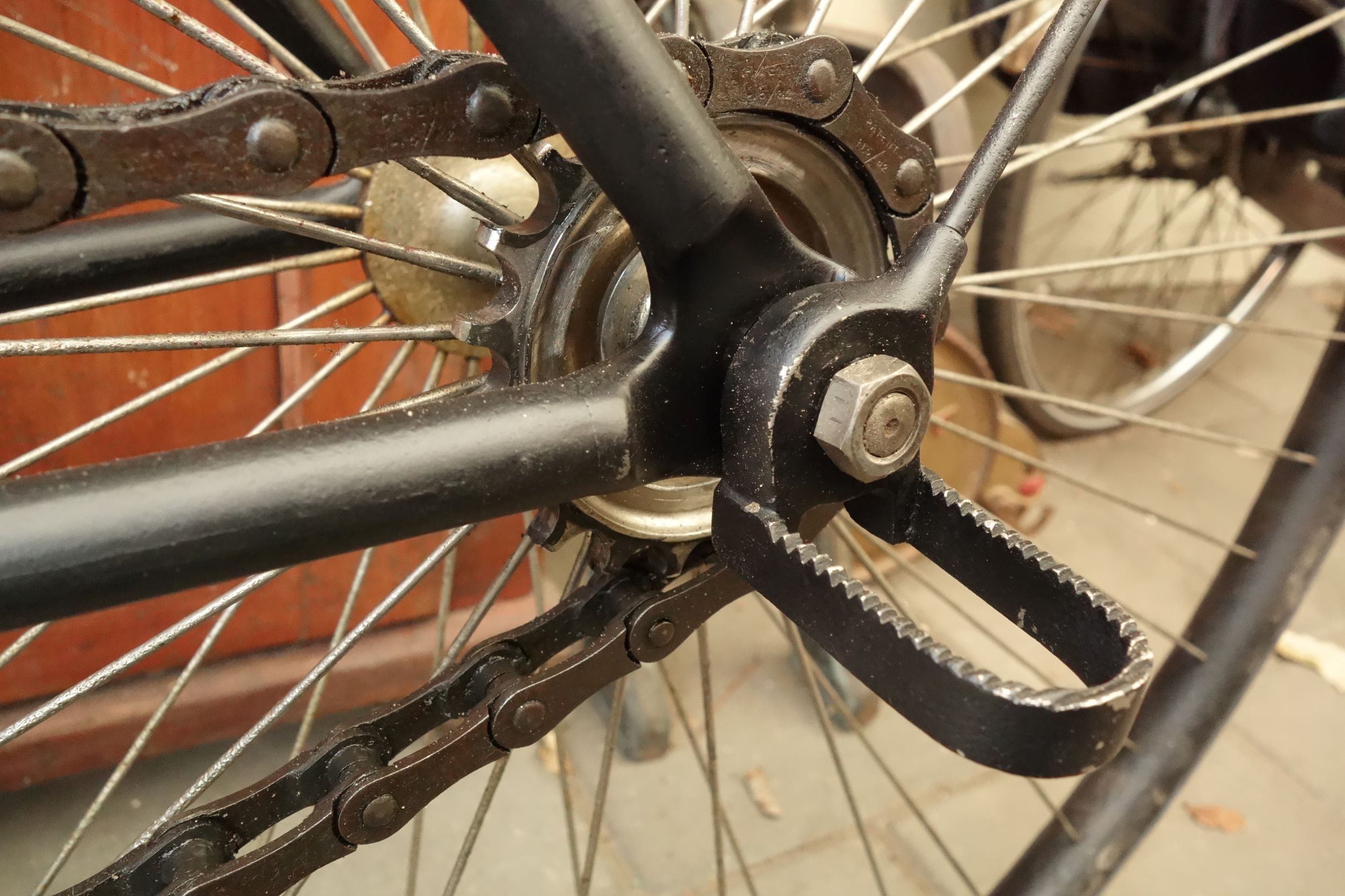 Een vierde bewijsstuk vond ik in een catalogus van B.A.Jansen. Daar staat een safety in met een ketting verstelstangetje schuin naar de achtervork.