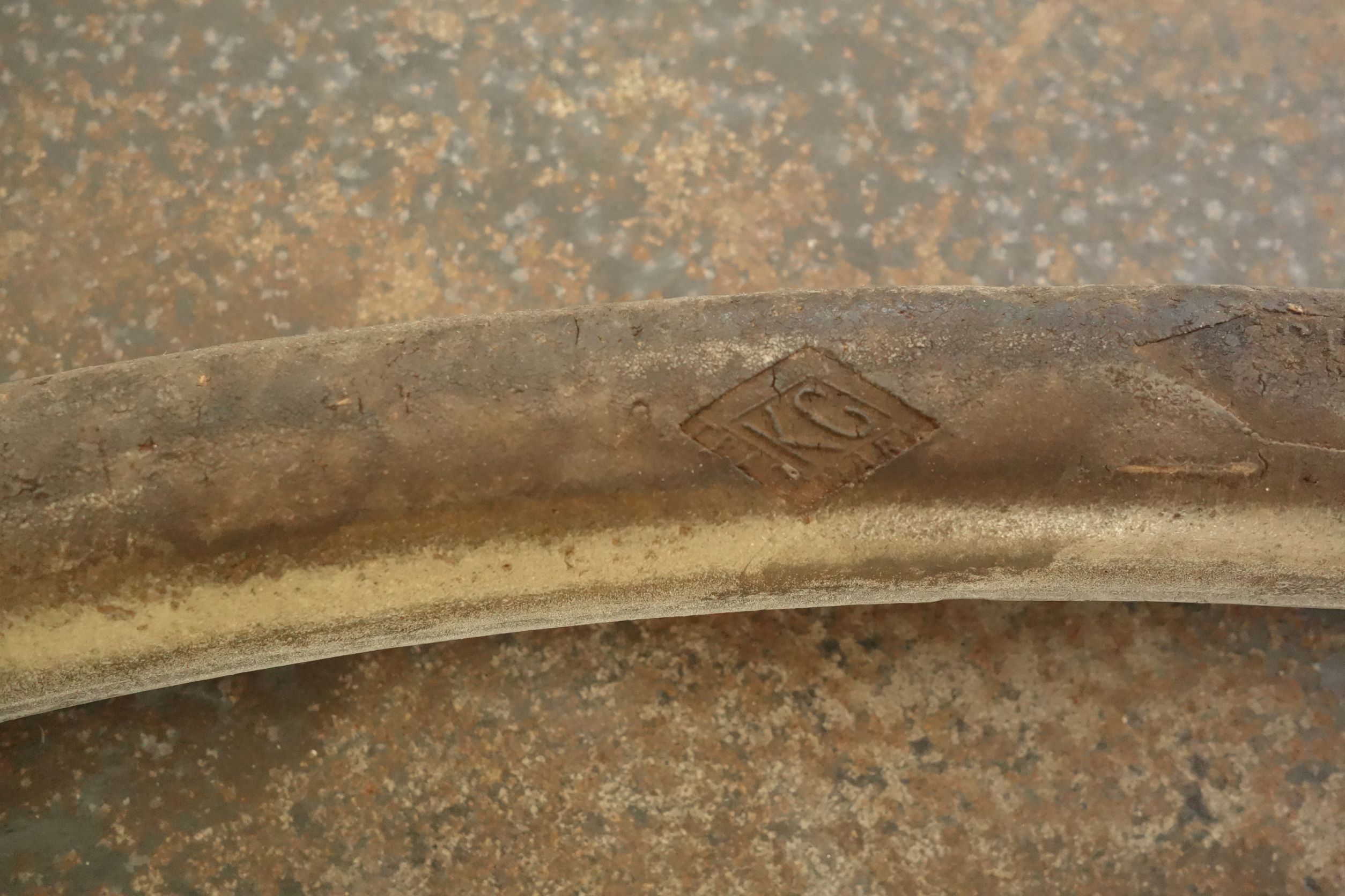 De banden die op de fiets zaten hebben leuke merktekens maar zijn massief en dus waarschijnlijk een 20e eeuwse toevoegingen. Ik denk dat ze als voornaamste toepassing gebruikt werden voor bloemen/markt handkarretjes . Ze zijn tamelijk zwaar.