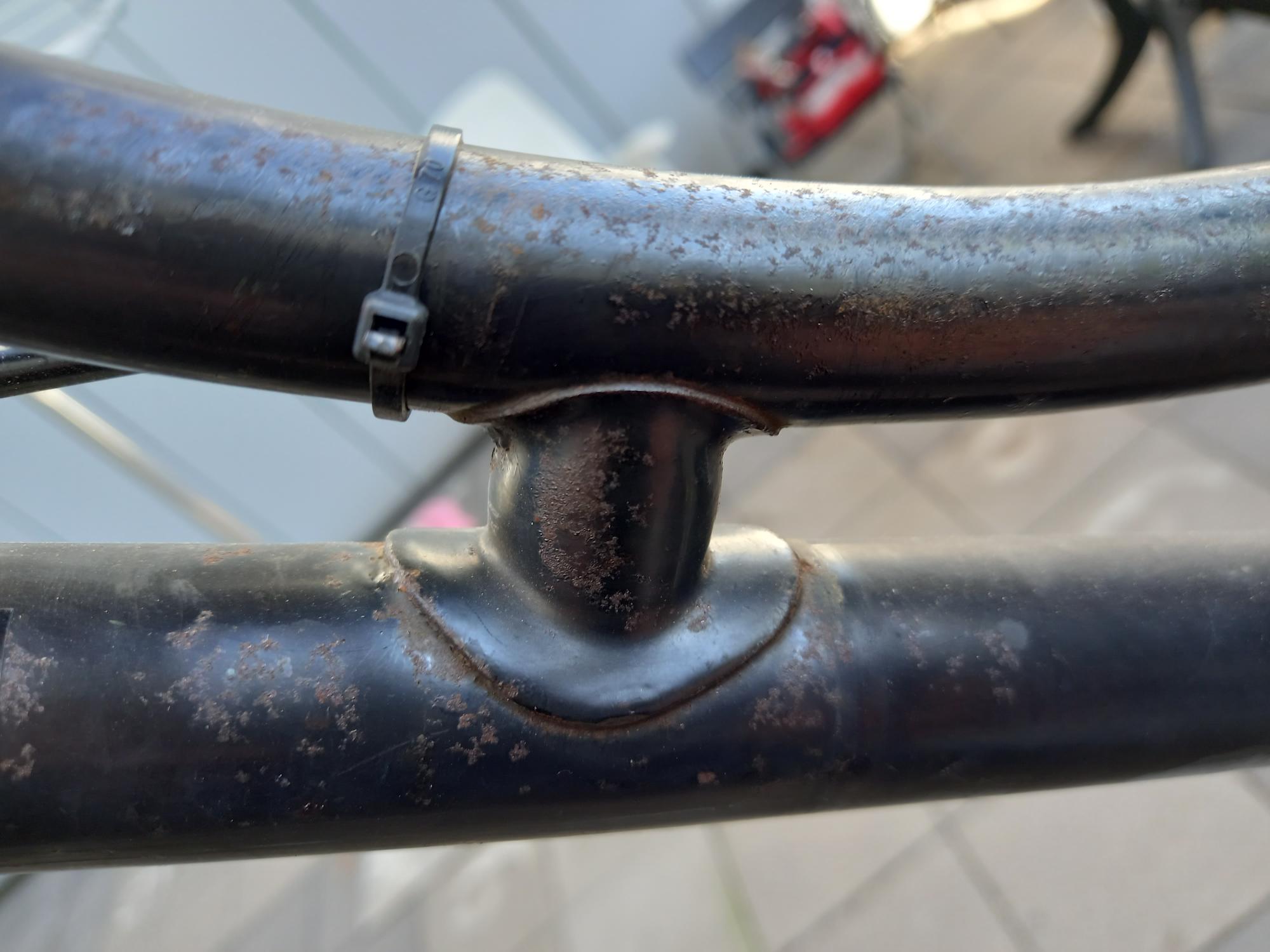 Het opvallendste aan het frame is wat mij betreft de knik in de gebogen buis en de bovenste balhoofdlug met 'geintegreerd' lager. Dat wijst wel naar een flink oude fiets. Eventueel zou hij ook Engels kunnen zijn.