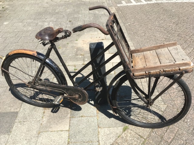 Mij is verteld dat deze in dienst van de PTT gebruikt is. Op foto’s van een PTT fiets uit die tijd zie ik echter niet de beige (?) gekleurde vlakken op de spatborden en op het rek van deze transportfiets staan.
