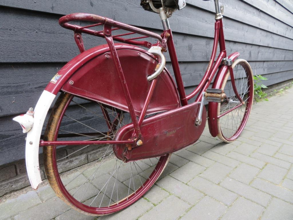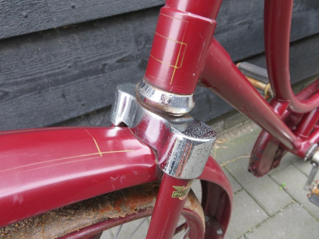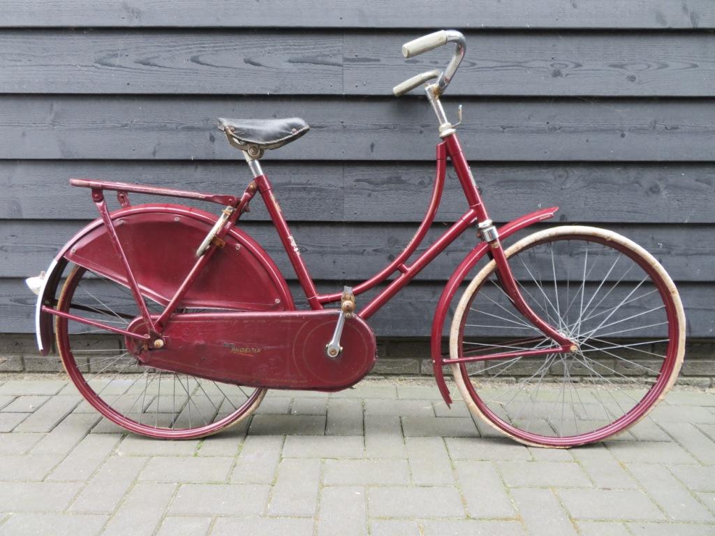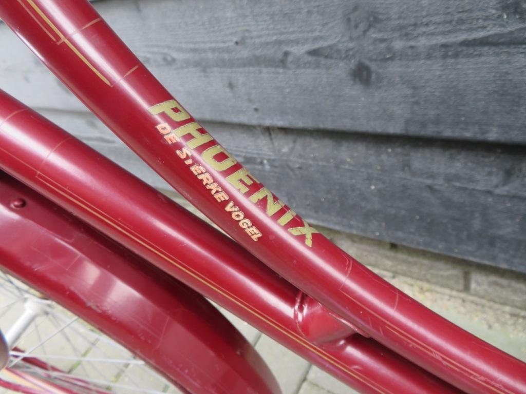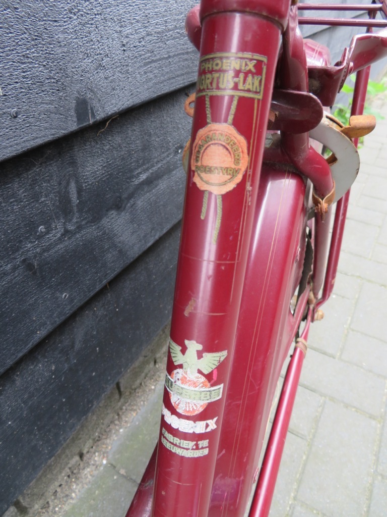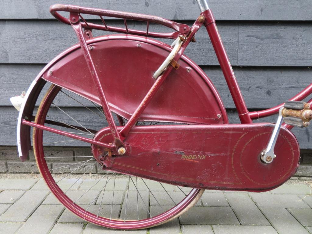 Een Phoenix Superbe Meisjes Rijwiel. Framenummer 192157, dus datering rond 1953. Klopt mooi met de folder van dat jaar uit de documentatiebank. Prachtige kleur rood met gouden accenten, doorlopend in het doek van de jasbeschermer en de kettingkast. Die moest mee