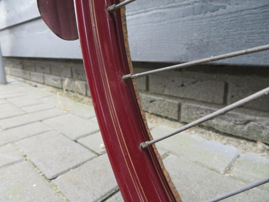 Restauratieplan: geen. Vanmiddag met wat lauwwarm water de fiets gewassen, de lak en de transfers kwamen mooi onder het stof vandaan. De banden zijn even oud als de fiets zelf en zijn in de loop der jaren knoepert hard geworden. Ik laat dat zo, heb ik besloten. Om de achterband te kunnen vervangen moet het lakdoek deels los, en gezien de droogtescheurtjes en de roestige knoopjes kan het doek daar alleen maar slechter van worden. Ik ga er toch niet op fietsen