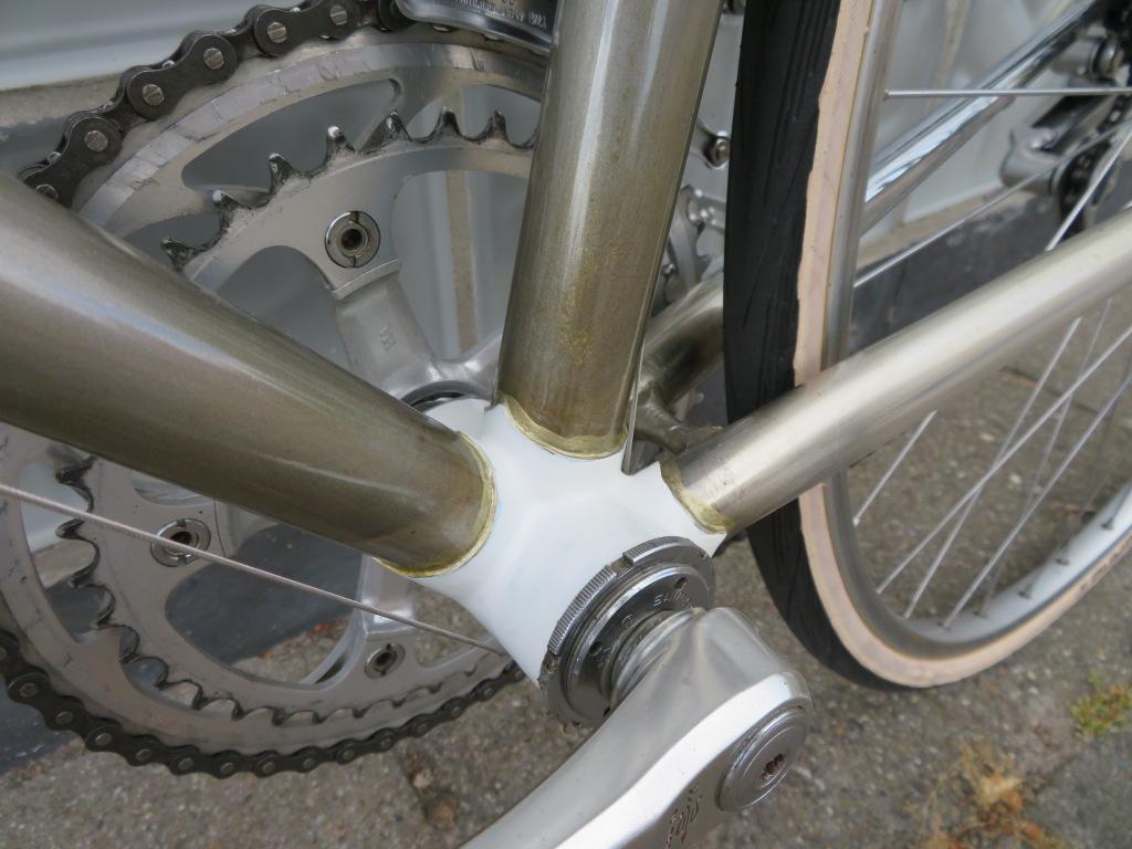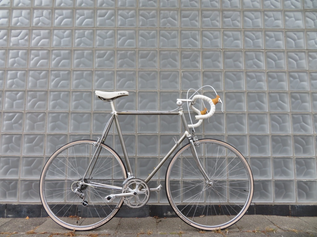Via via kreeg ik een Concorde frame in handen. De lak was in een vreselijke staat, maar de originele onderdelengroep toonde amper slijtage. Puur voor de lol om naar eigen smaak iets aparts te maken heb ik alles uit elkaar gehaald, frame kaal gemaakt, wat in de weer geweest met blanke lak en witte en gouden Hammerite en vervolgens de onderdelengroep (Shimano Golden Arrow) weer teruggeplaatst. De remgrepen (de wat zeldzamere BL-H105, met de 'dichte gaatjes' in de greep) heb ik NOS van Ebay inclusief rubbers, de rest van de Golden Arrow groep was al aanwezig.. tot de bottom bracket aan toe.