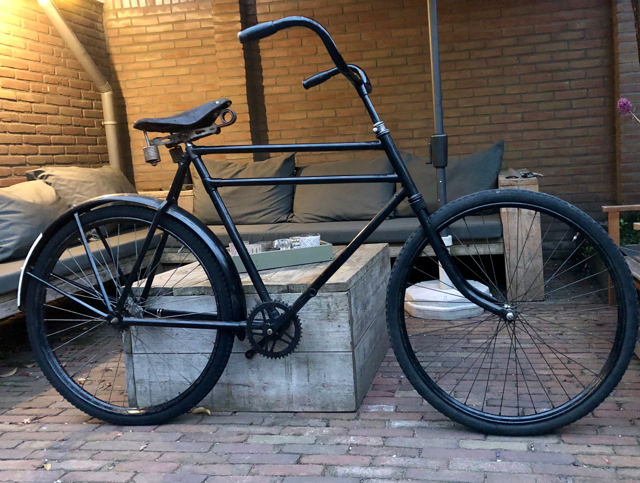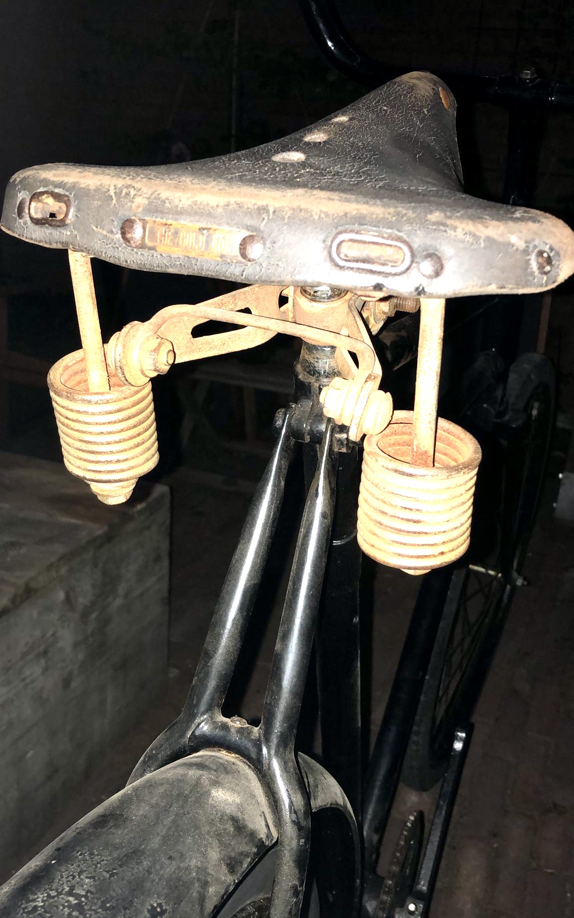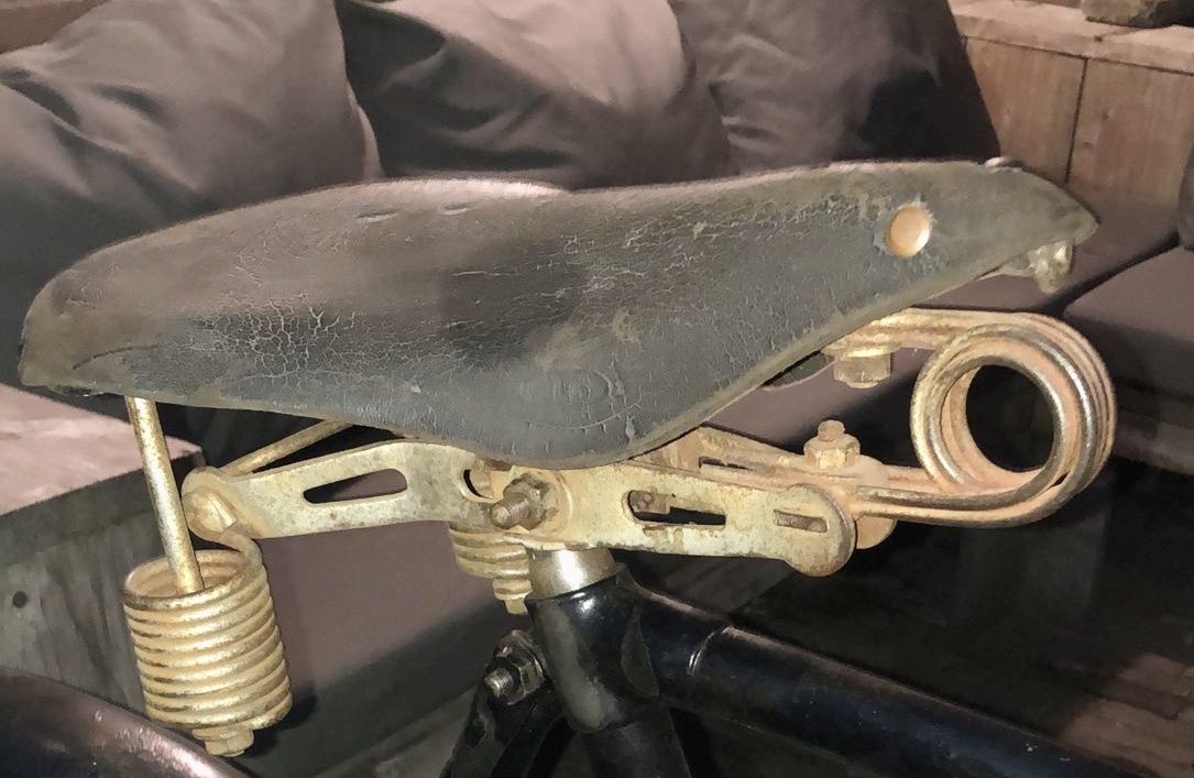 Ik heb sterk het vermoeden dat dat zadel er nog niet zo lang op zit. Zit er nou een rechte zadelpen op? Dat kwam niet voor op transportfietsen. Maar ook dit model zadel met alleen hangveren aan de achterzijde is zeer ongebruikelijk voor transportfietsen. Zadels met enkele strop dan weer wel, met name bij vroege transportfietsen uit de jaren '20 en enkele in de jaren '30 zie je wel zadels met enkele strop in de folders. Het heeft wel alle kenmerken van een vroeg zadel, die kwa leeftijd wel in de buurt van de fiets zou kunnen komen.