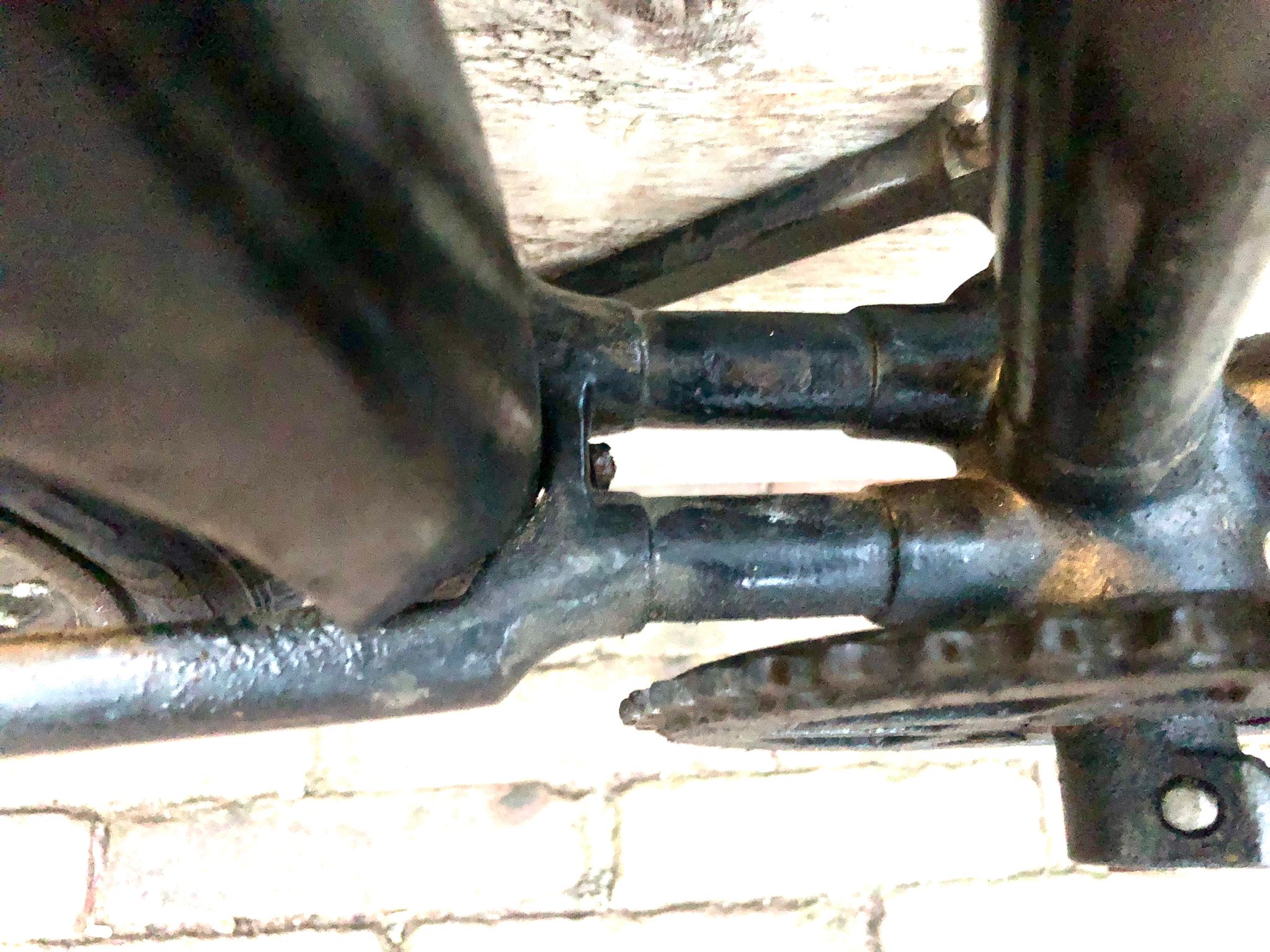 Ook interessant is de achtervork constructie. Een ingesoldeerde achterpad zoals typisch voor jaren '20 (transport)fietsen, maar dan met normaal model staande achtervork met bouten verbonden. Of de maker was het laaste restje van deze achterpadden aan het opmaken, en had geen staande achtervork buizen meer hiervoor, of de staande achtervork is ooit vervangen (waarschijnlijker).