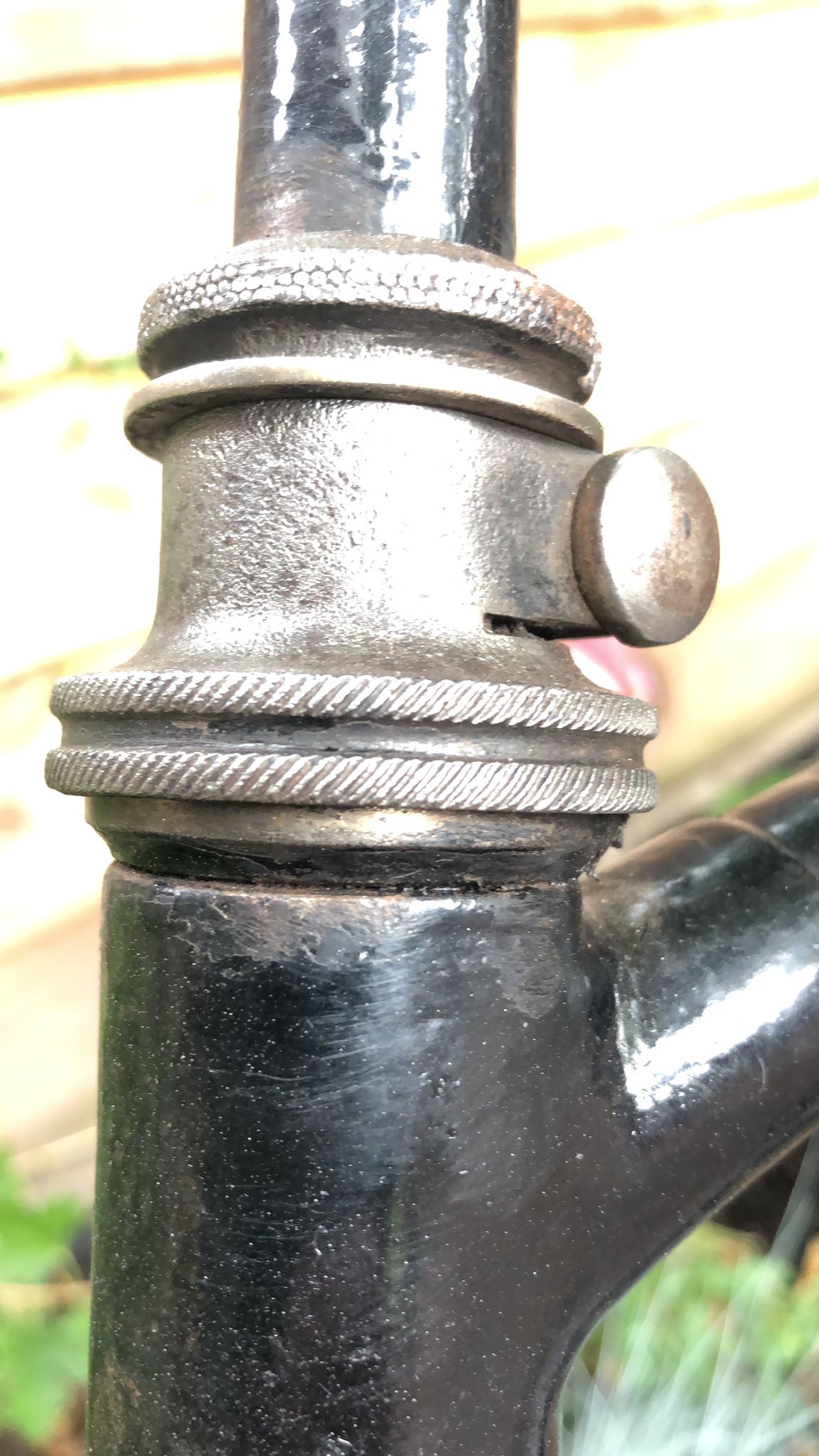 Verdere opvallende details aan deze fiets die wijzen op een vroeg exemplaar, gladde balhoofdbuis: