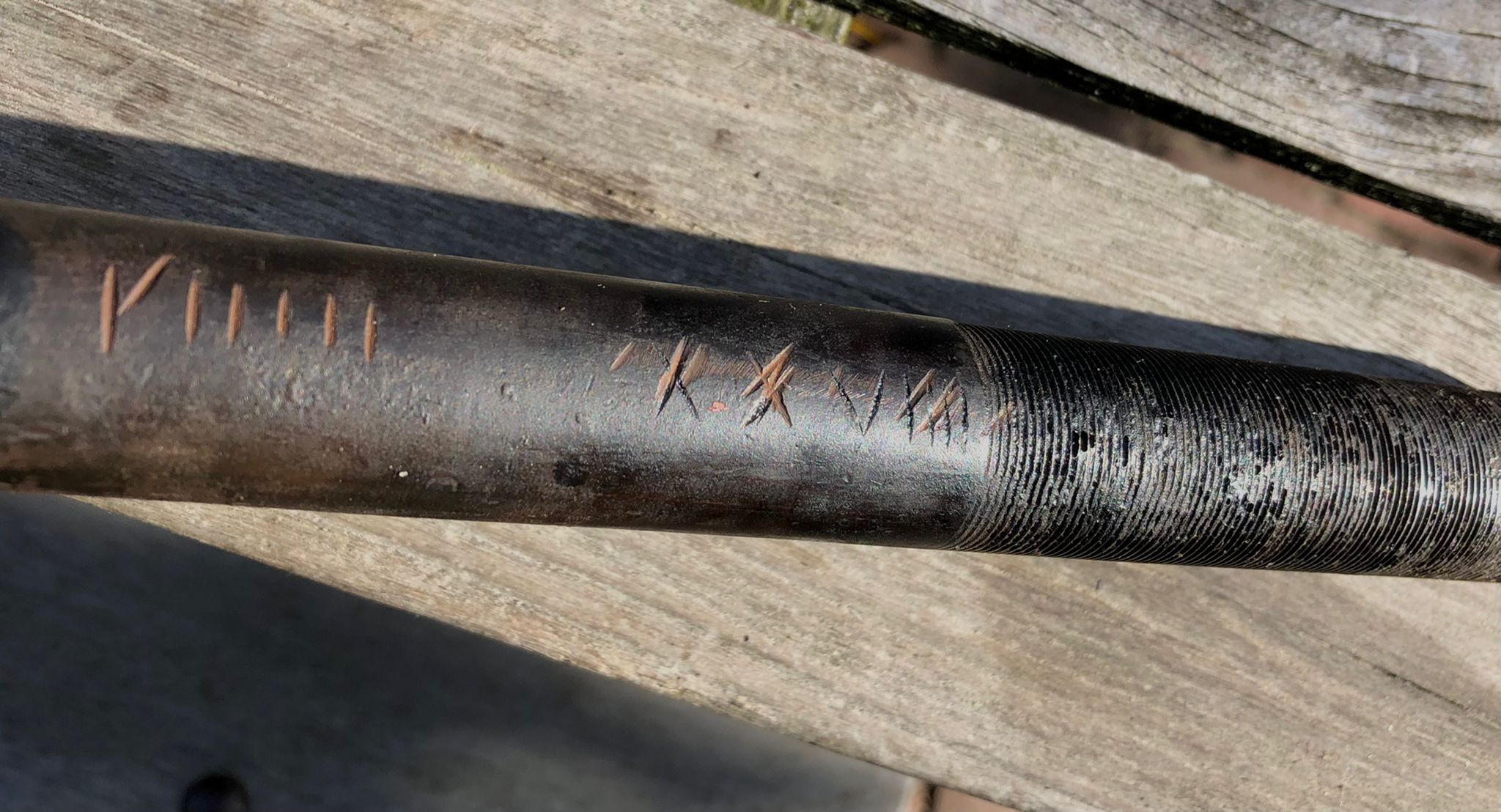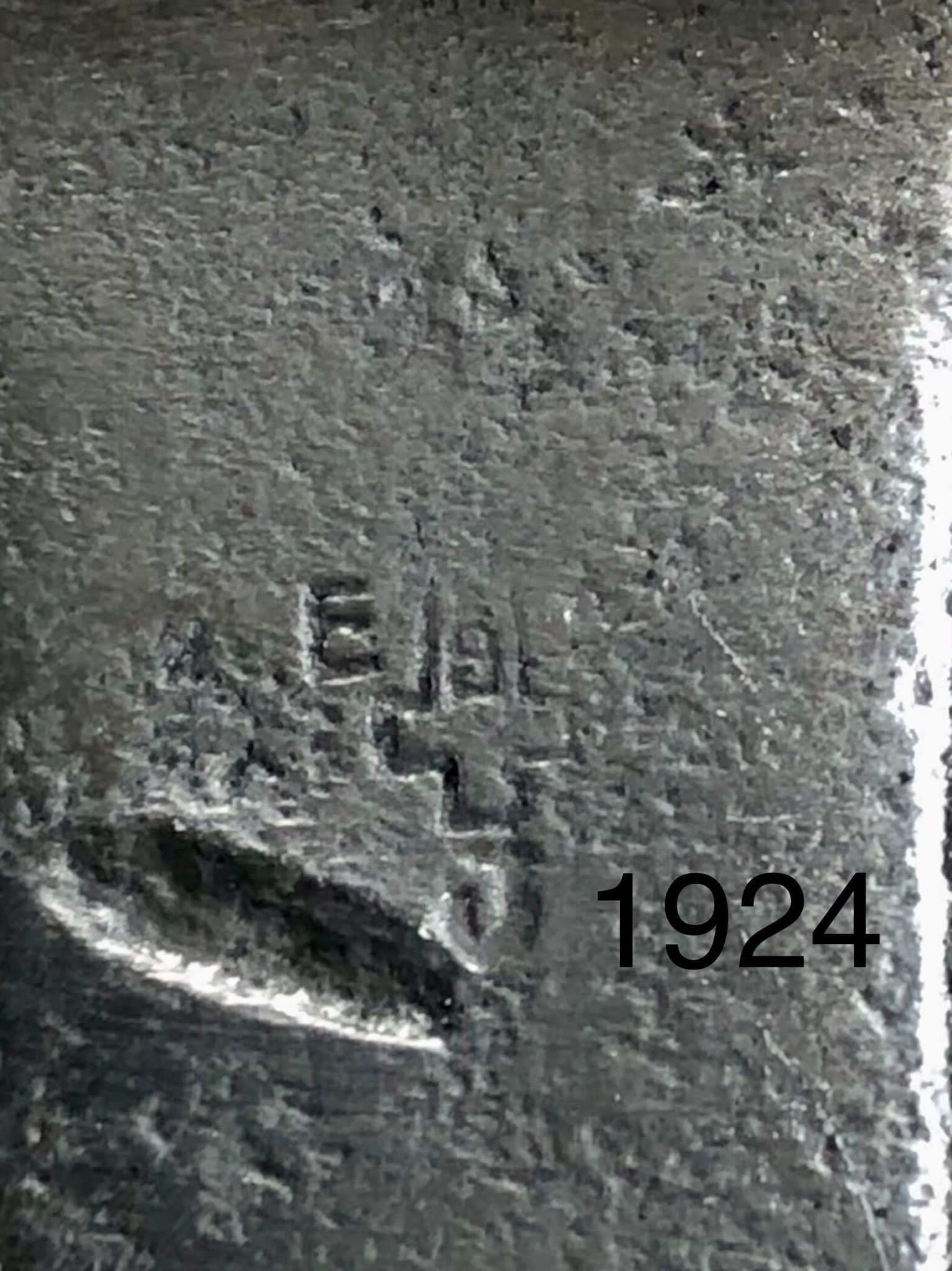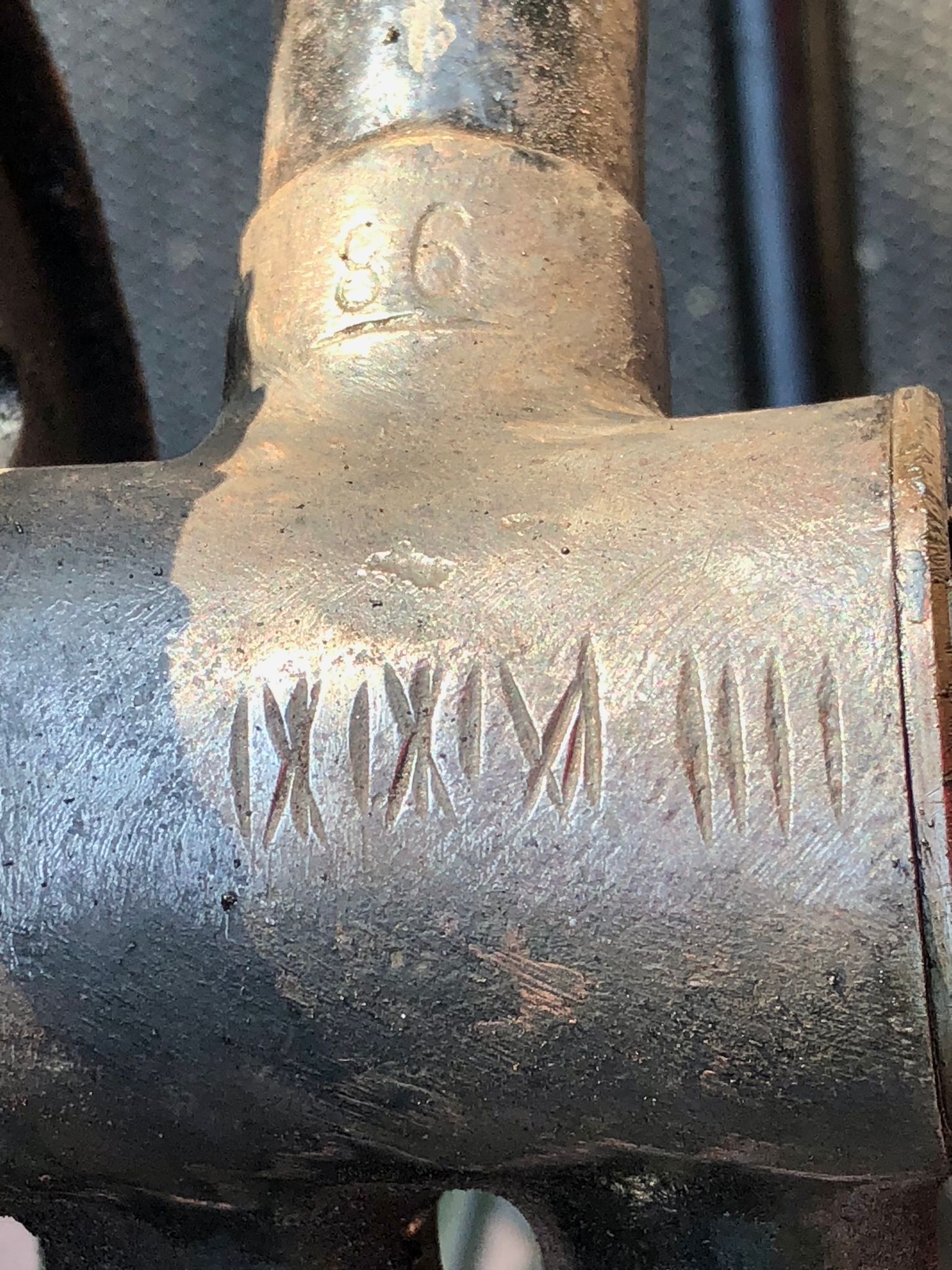 Op de voorvork lijkt onder andere XXVIIII te staan, en op het trapashuis IXIXIVI IIII. Het vermoeden is dat XXV het bouwjaar is, en IIII de maand? Maar zeker is het niet.