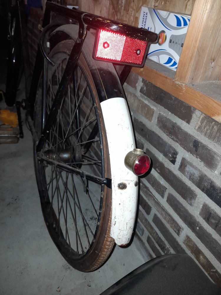 Mooie fiets hoor! er hoort zo te zien nog een kapje met fitting op het achterlicht. Staat er Rijkskeurmerk 2D op het achterlichtje? In dat geval is hij van NV Metaalwarenfabriek Drenthina, Hoogeveen welke goedkeuring heeft gekregen in de Nederlandse staatscourant op 25-11-1937.