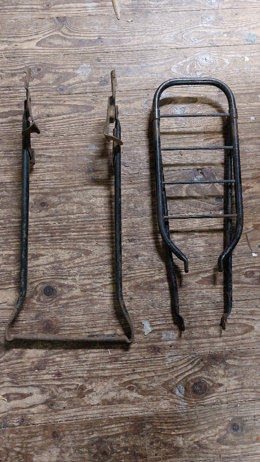 - Een Gazelle achterdrager met de poten naar de as i.p.v. het frame. Op de beurs kwam ik deze originele(?) standaard tegen, maar had er niet aan gedacht dat de drager dan ook op de as moet zitten. De lengte van de poten is nu 39 cm hart tot hart, dit moet zijn 42 cm. Losse poten van de juiste lengte is eventueel ook goed.