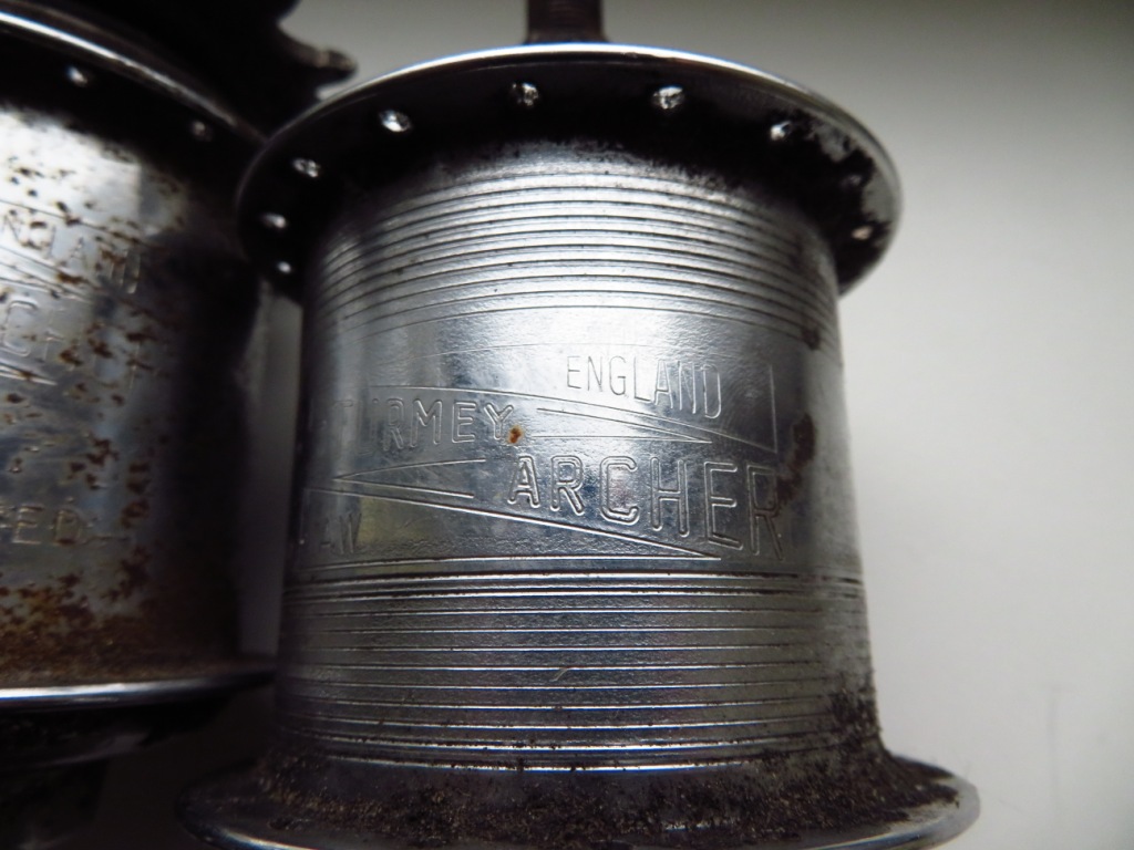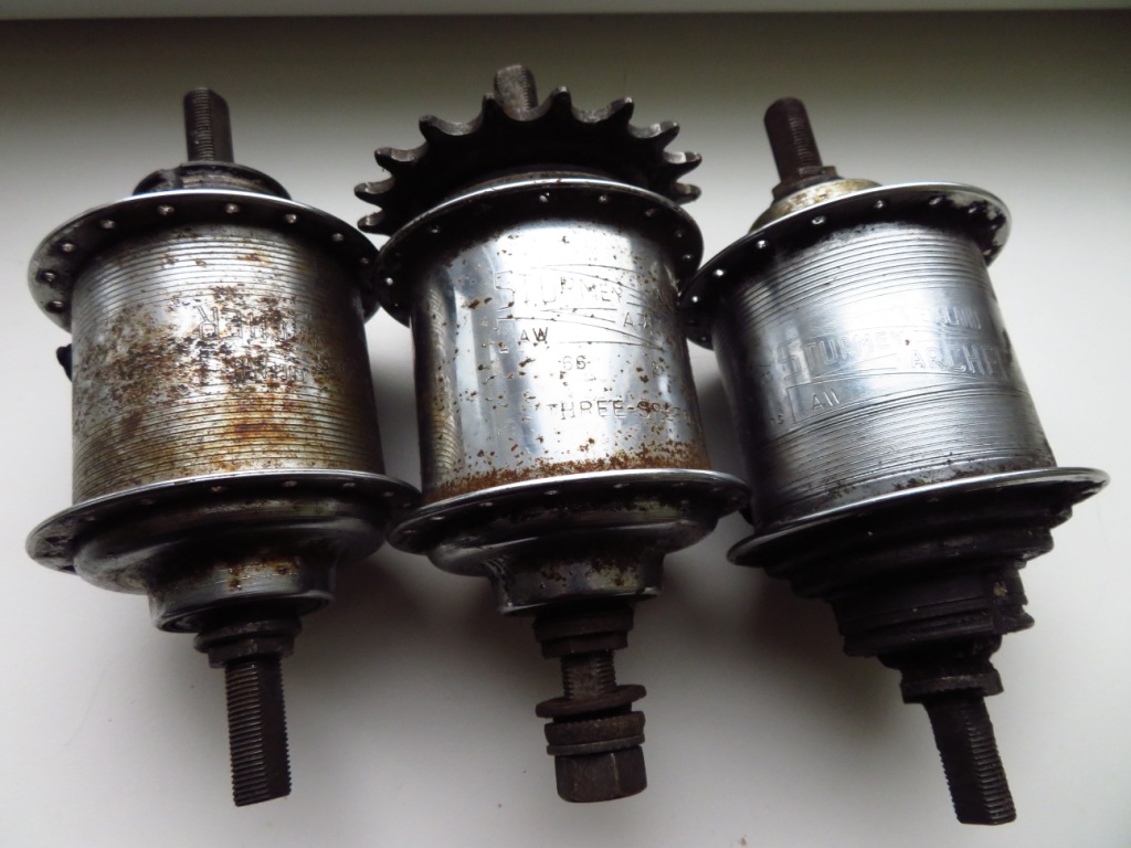 -3x Sturmey Archer type AW (3speed freewheel rear hub, 36 gaats) uit 1966, 1976 en 1978.