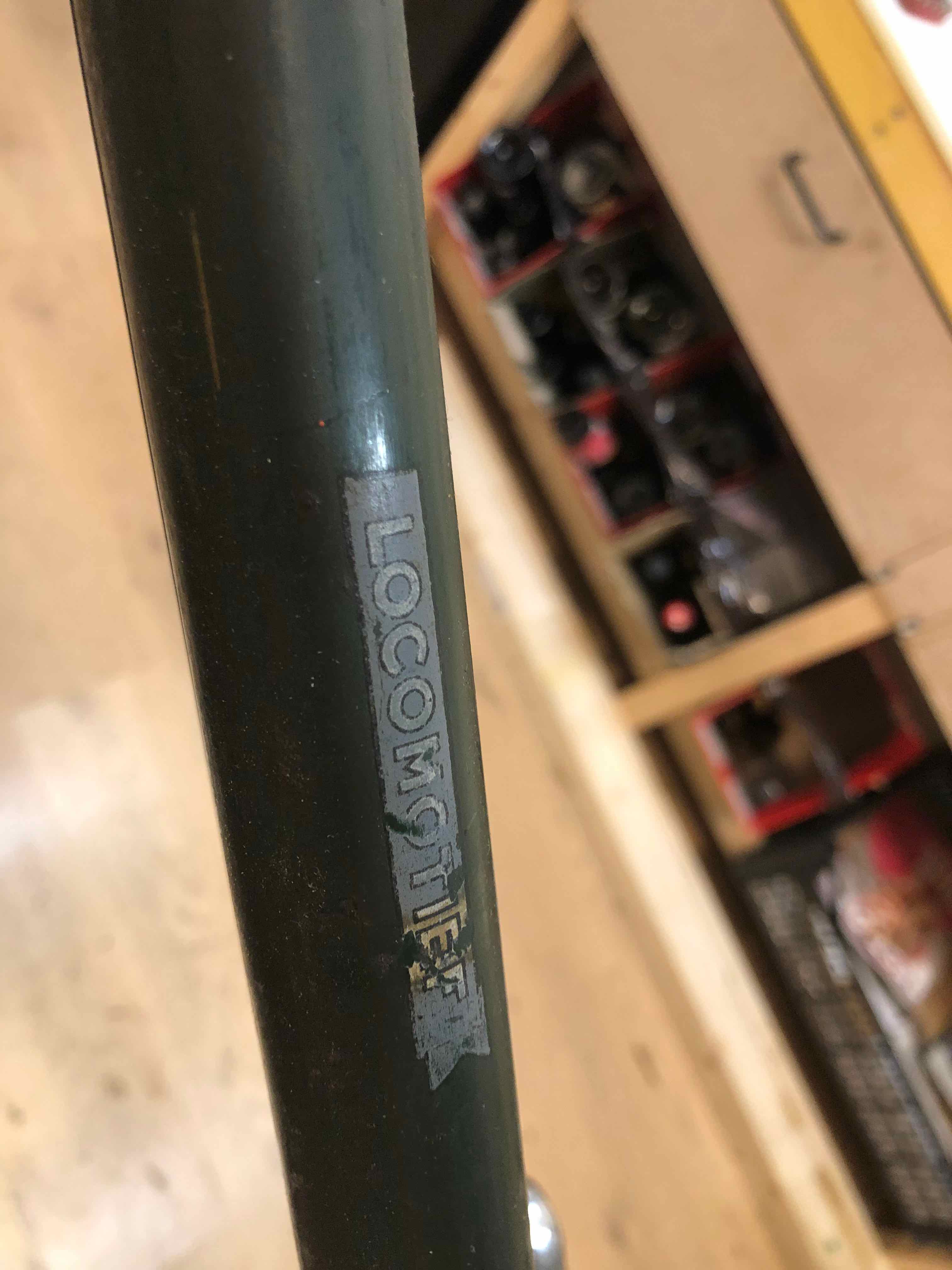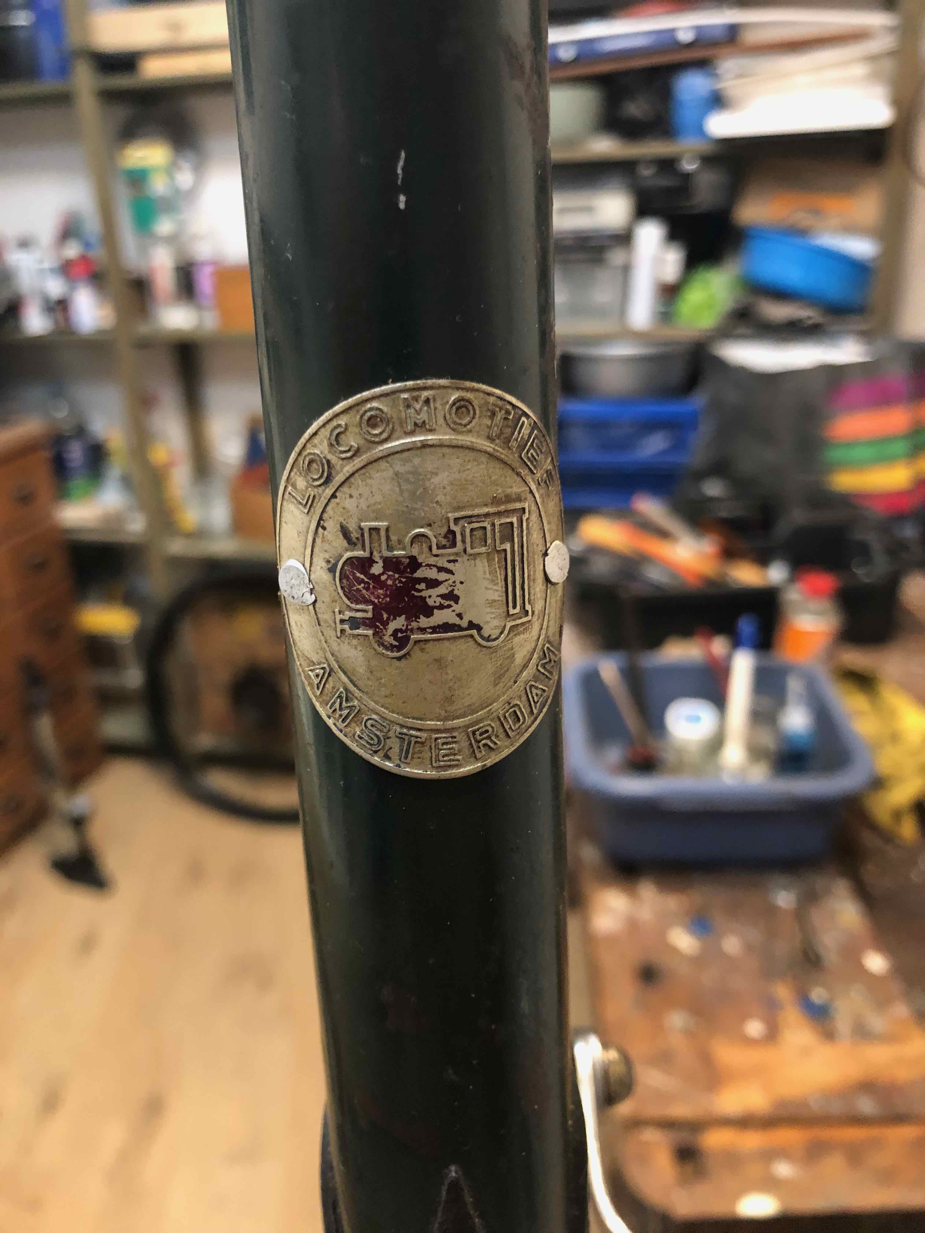 Met locomotief balhoofdplaatje (iets links uit het midden vastgeklonken