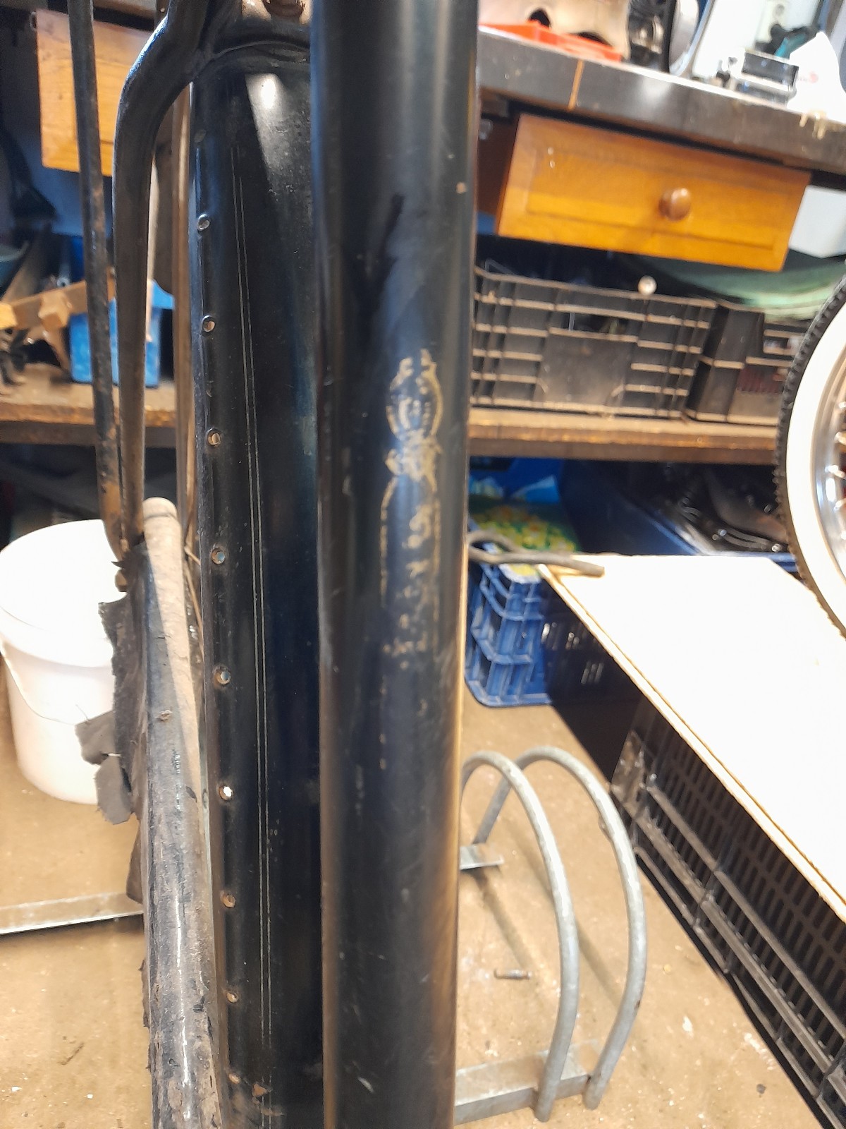 Deze prachtige dame uit 1921 heb ik deze week opgehaald. Er mist de rechtse " rembegeleider" voor aan de voorvork. Heeft iemand toevallig dezelfde " over"?