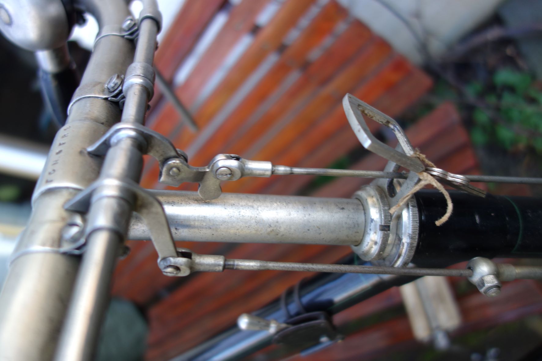 Het remsysteem is van Fongers en is volgens het eenvoudige systeem met bandjes om het stuur.