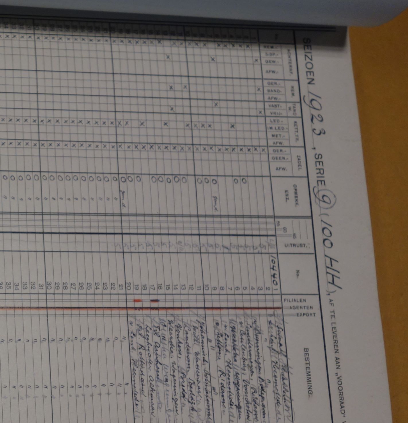 En de pagina uit het seriegarantie boek van Fongers . Bij drie fietsen is aangekruist dat er een drie versnellingen naaf in zit.