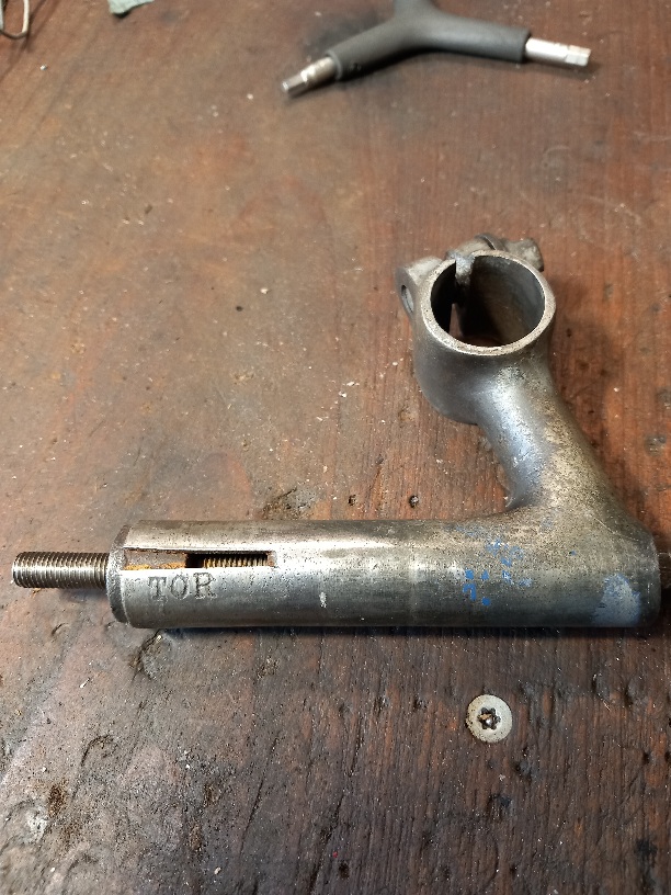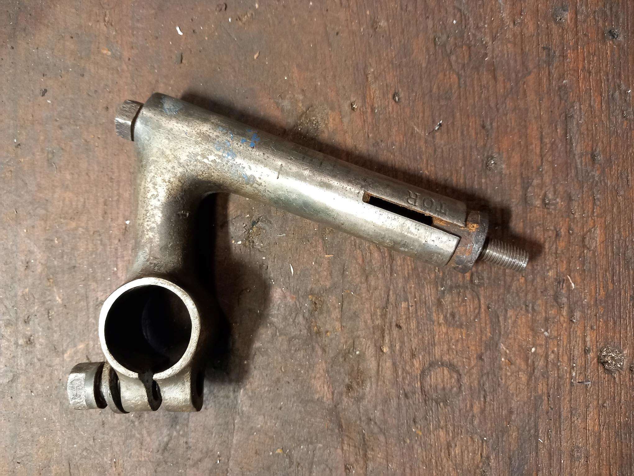 het is een stalen stuurpen, diameter 22,2, met resten van nikkel (denk ik) en wat blauwe verf. De stropbout heeft een vorm die ik nog nooit tegenkwam. Buiten de letters TOR staat er niks anders op.