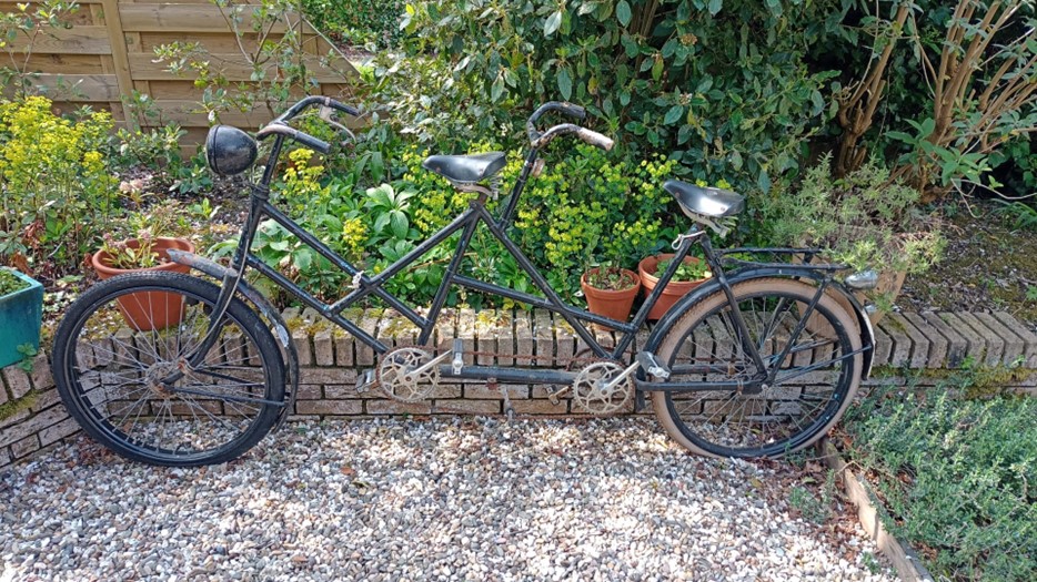 Deze tandem heb ik 40 jaar geleden gekocht. Ik wilde er wel op rijden, maar dat werd het nooit echt. Nu wil ik vooral meer over die tandem weten. Wanneer is die gemaakt? Is het echt een Cyrus? Hoe heeft hij er origineel uitgezien? Hij maakt wel een flink verbouwde indruk.