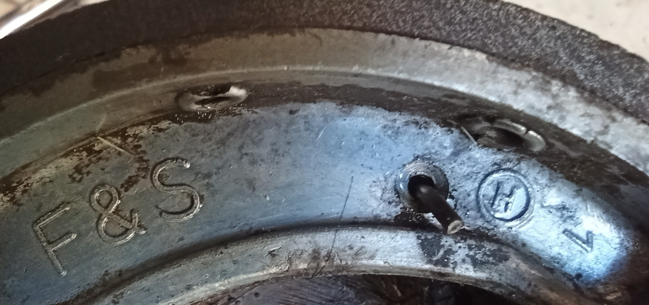 In de trommelrem van het voorwiel voor staan het F&S logo, de letter H en een 1. Gebruikte F&S dezelfde nummering voor deze remmen als voor terugtrapnaven? Dan zou de H op 1965 slaan.