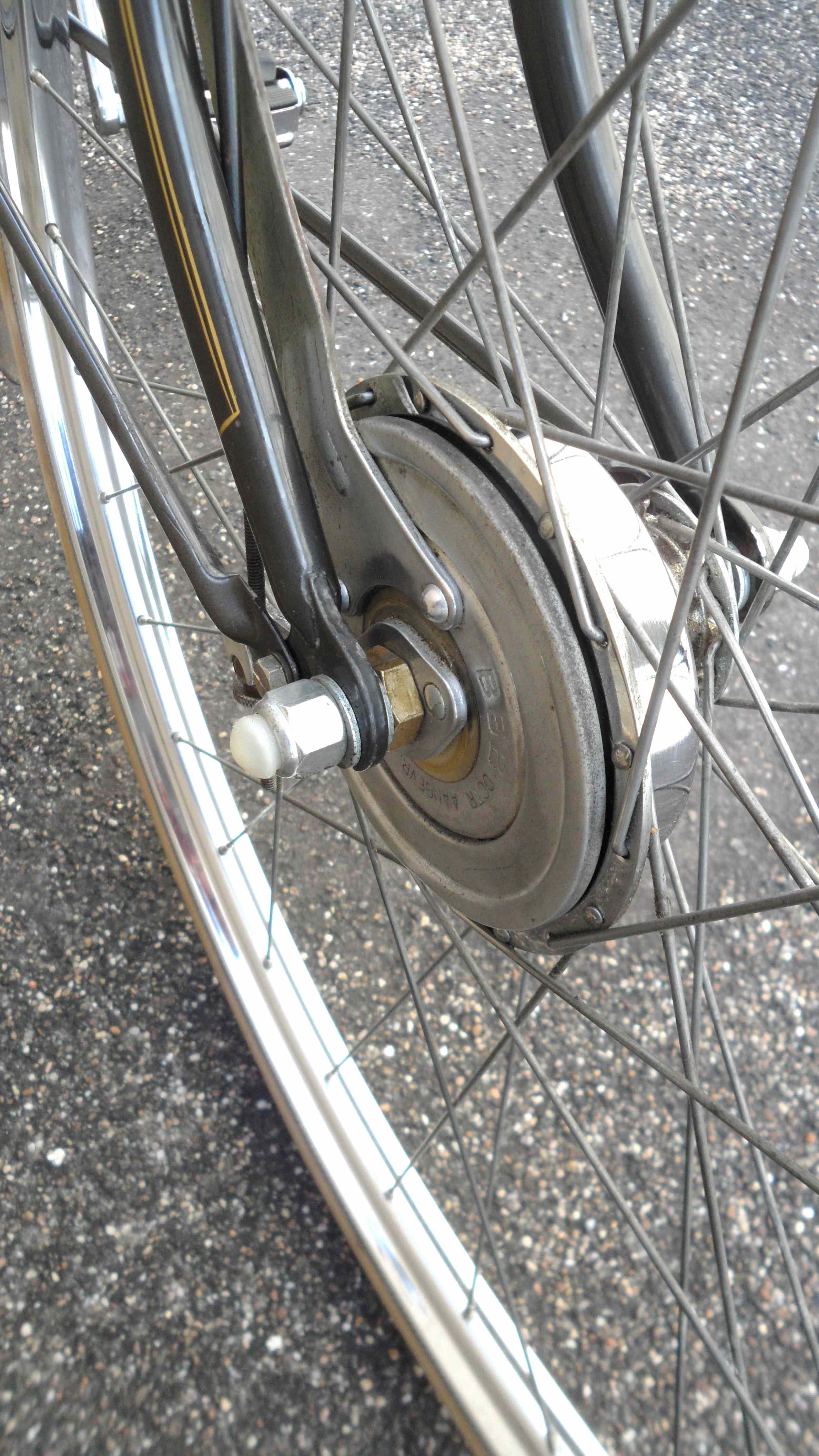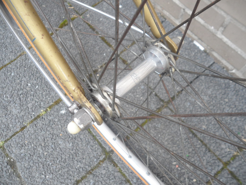 De fiets lijkt, op de banden na, geheel origineel te zijn. Het lijkt me daarom onwaarschijnlijk dat de moeren niet origineel zijn - die grote ring hoort er niet achter, die is er vermoedelijk achter gekomen bij de poging de andere vooras moer te demonteren, wat niet lukte.
