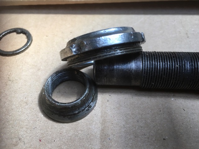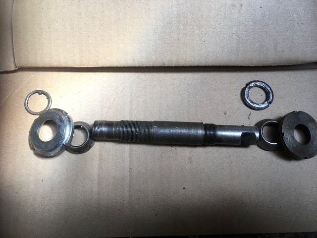 Er zit een trapas in die ik nog nooit gezien heb. Een soort kruising tussen een BSA en Thomson trapas. Er zitten ingeslagen cups in het bracket en in de cups zit aan beide kanten schroefdraad waar een afdek kap op geschoefd wordt.