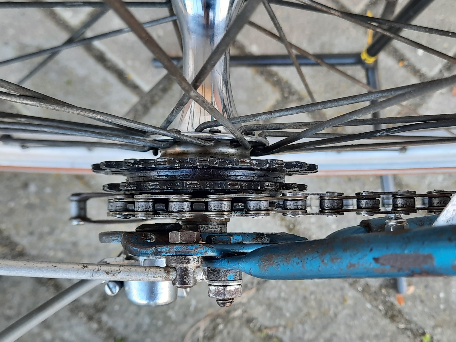 Wat ook opvalt is dat het laatste kransje maar eenzijdig afgeschuinde tanden heeft. Aan de binnenkant zijn de tanden haaks, misschien blijft het tandwiel daarom haken op de binnenschakels