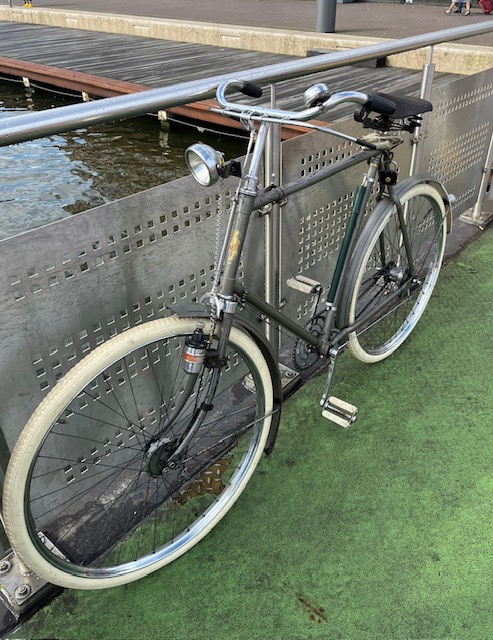 Hij is nog niet klaar; er moet nog een setje Fongers pedalen op wat ik al klaar heb liggen, een lakdoek kettingkast waarvoor ik de moed nog moet vinden om de schaar er in te zetten en bij voorkeur een een mooi jaren 30 slot. De bagagedrager laat ik er voorlopig vanaf.