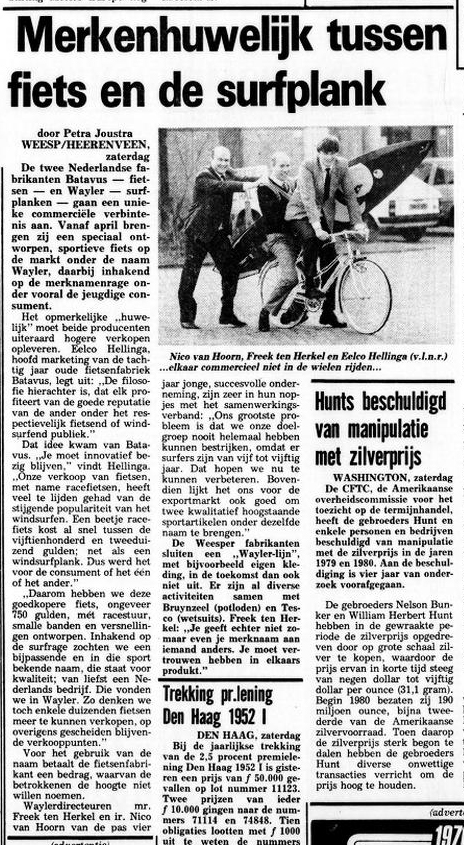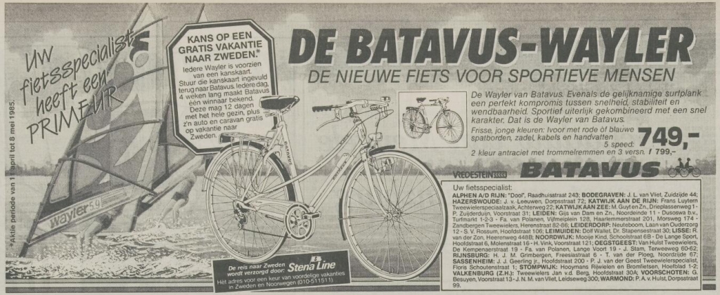 Voor velen hier op het forum misschien niet interessant genoeg, maar recent heb ik een Batavus Wayler aan mijn collectie kunnen toevoegen. Het is er haast eentje voor de kop curiositeiten. Wayler was mid jaren '80 een hip surfplankenmerk uit Weesp, Batavus maakte o.a. verrekt mooie racefietsen maar stevende af op het 1986-failliessement. In 1985 besloten beide bedrijven samen een fiets op de markt te brengen: de Batavus Wayler. Ietwat ongemakkelijke persberichtjes verschenen, en ludieke win-acties.