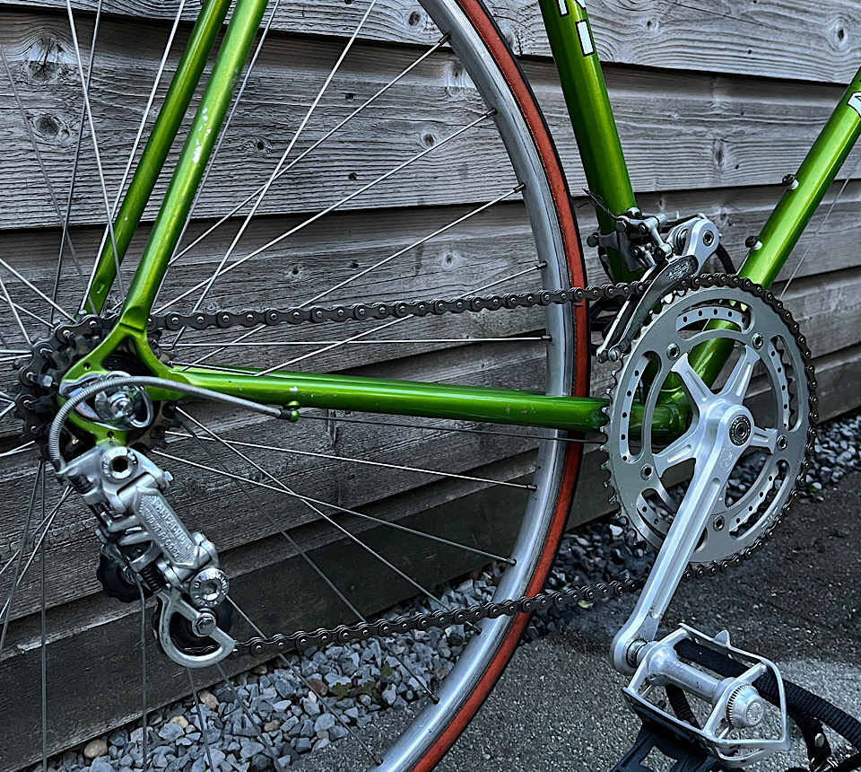 Ik schat hem overigens iets jonger: de kabeltunnels op de bovenbuis en de versnellingskabels onder het bracket doen eerder begin jaren '80 vermoeden.