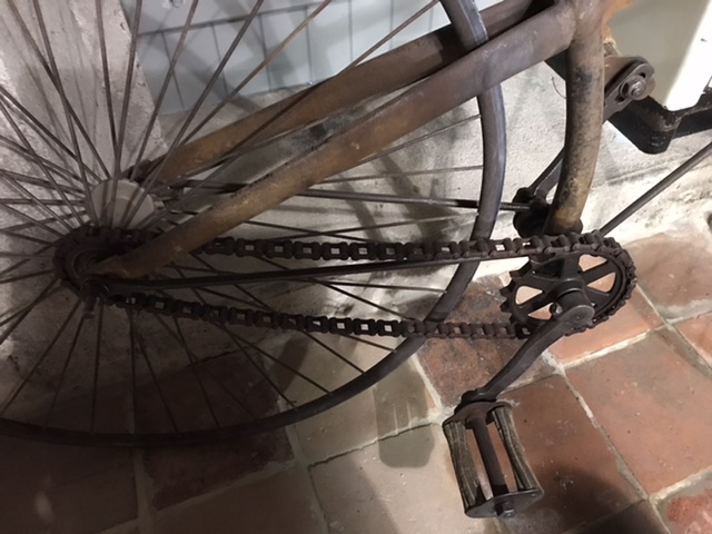 Hierbij wat foto,s,deze is niet gerestaureerd en heeft nog een klein beetje originele verf,ook zit er een origineel achterspatbord bij,en het frame en wielenhebben alle hetzelfde nummer 1801 en de trappers hebben ook nummers,