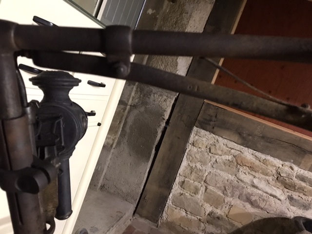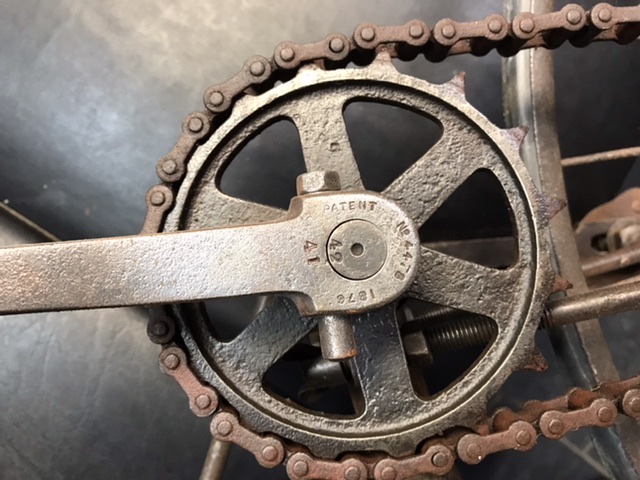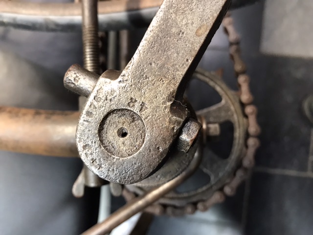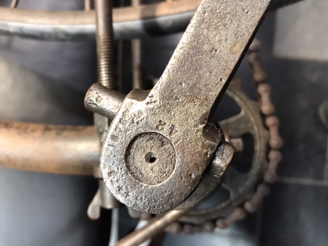 Hierbij de Foto,s van de trappers en crank,patent uit 1876 ? Op de wielnaven staat 1877 helaas lukt een foto nemen daar niet van