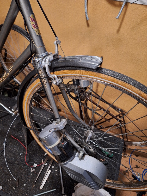 fietsemaker, met een "R" op de bel - van Rivel, neem ik aan - en voor de rest lijkt de fiets veel op deze e-fiets; zelfde type kettingkast, zelfde achterlicht enzovoort.