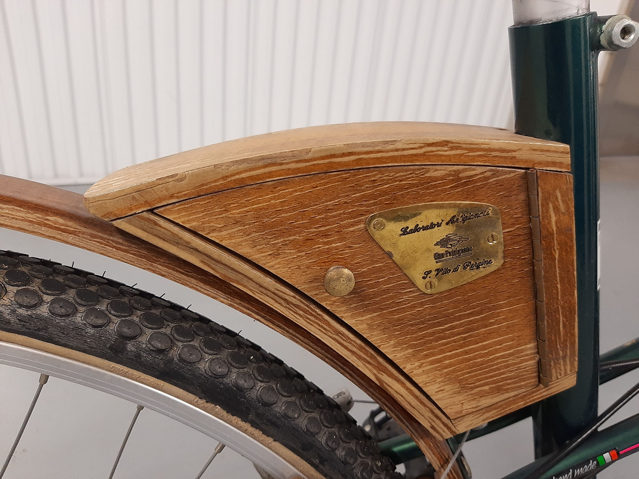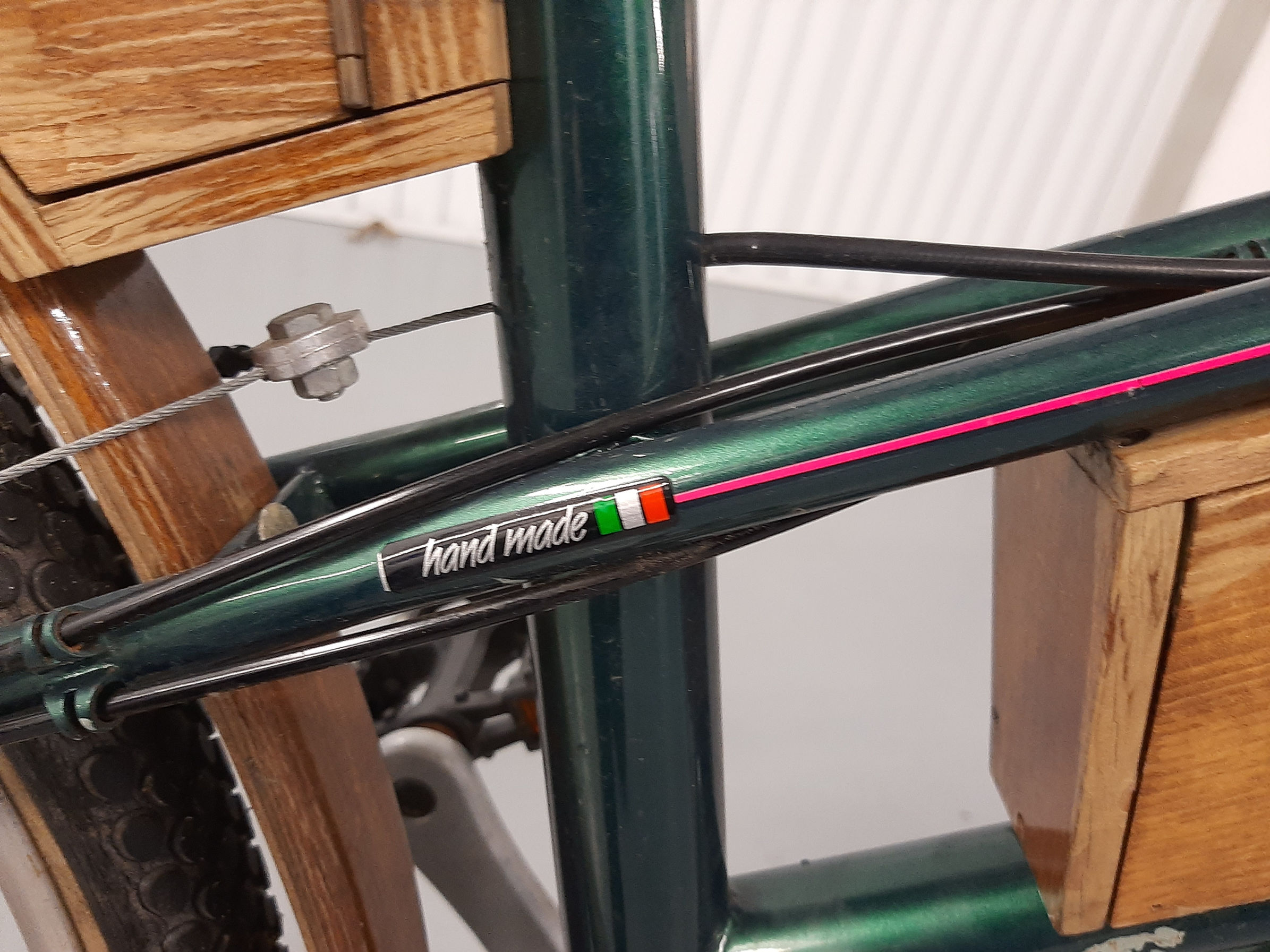 Op de fiets staan ook gegevens (zie de koperen plaatjes) over de bouwer van de fiets. "Labatori Artigianali, San Parigindo, S. Vito di Pergini en nog op het kastje "Milos?"Hierover kon ik niets vinden op internet. Immers in de jaren 80 had men nog geen webside.