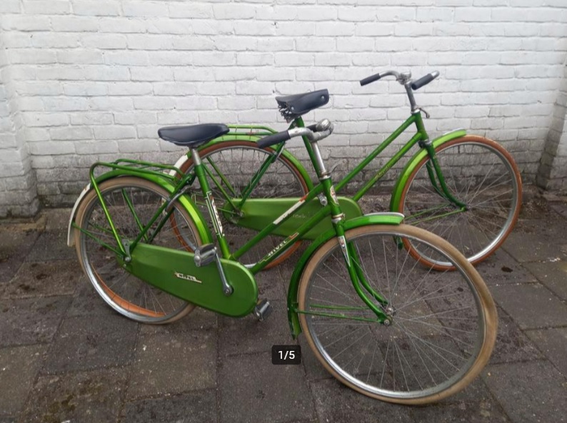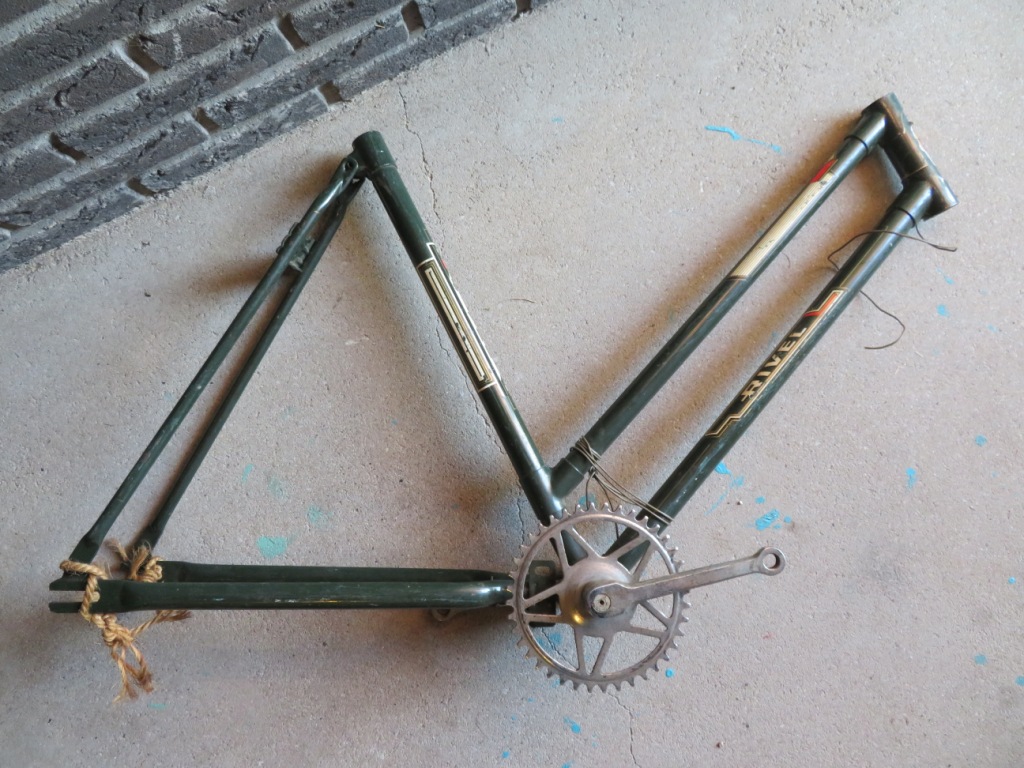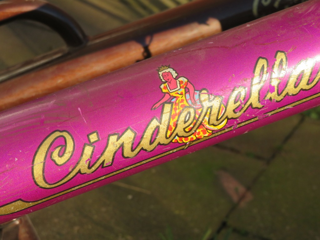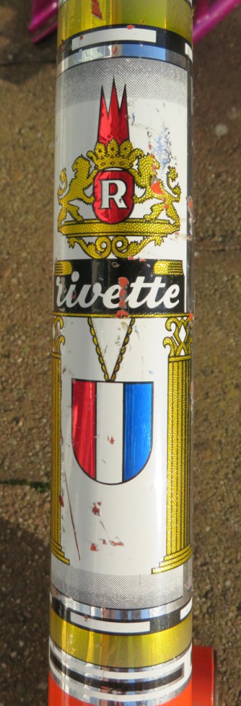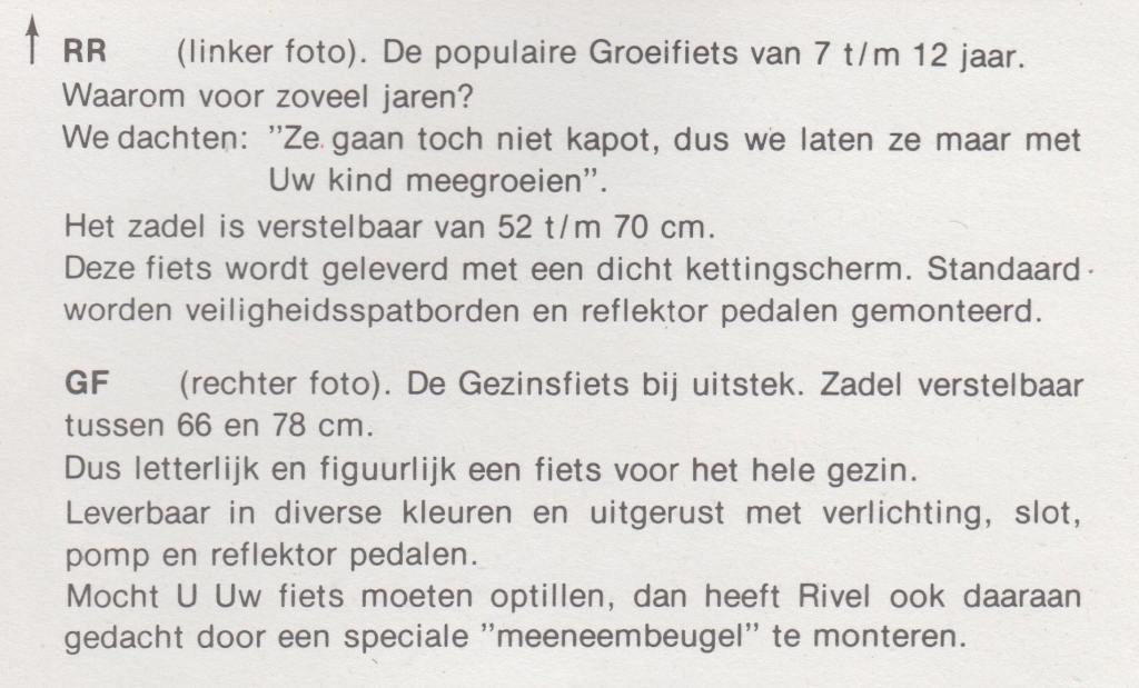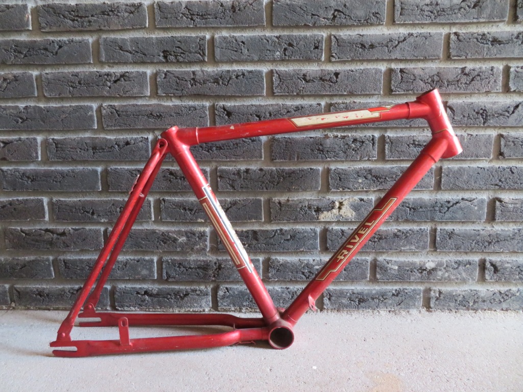In totaal zijn het 8 frames, zonder voorvorken. Een jongens racefietsje, een Rivette groeifiets met een sticker in Franse stijl want waarom ook niet, enkele Cinderella gezinfietsen met 'optilbeugel' en nog wat meisjes/dames frames. Unieke frames om te zien en moeilijk om er een hele fiets bij te fantaseren. Gelukkig ligt thuis de folder van Rivel uit 1977 waar ze allemaal in volle glorie in staan: