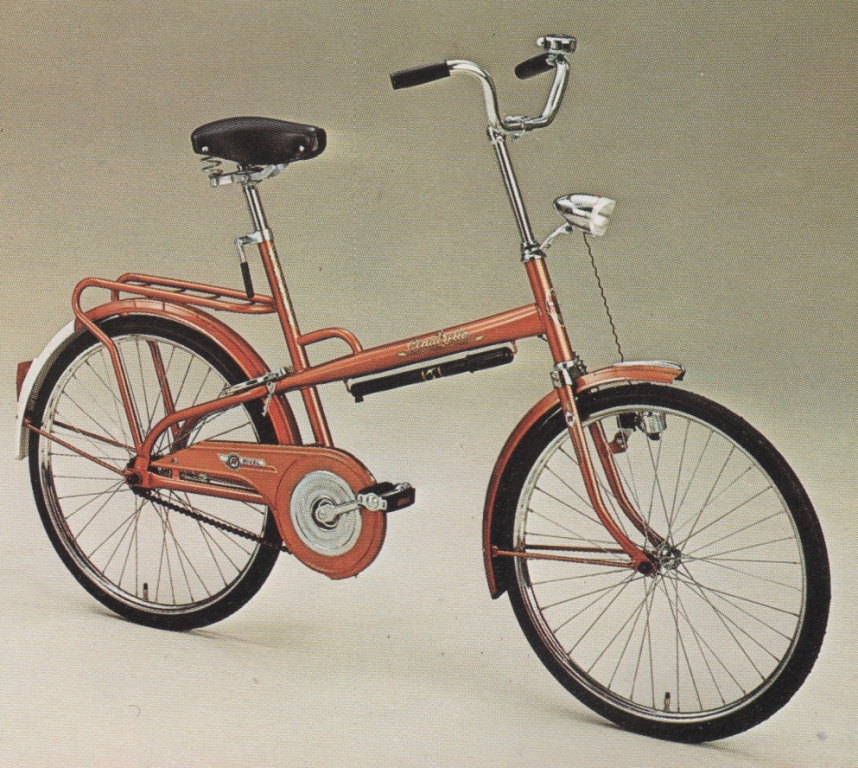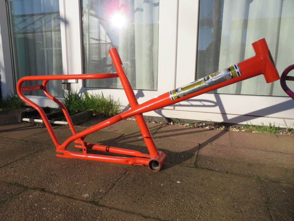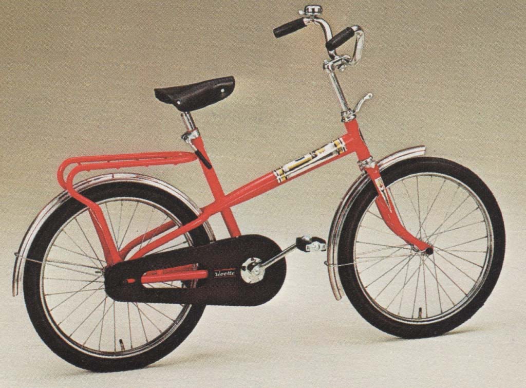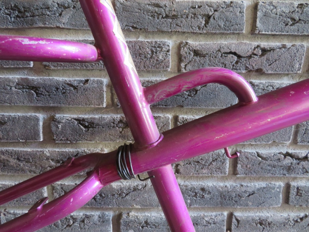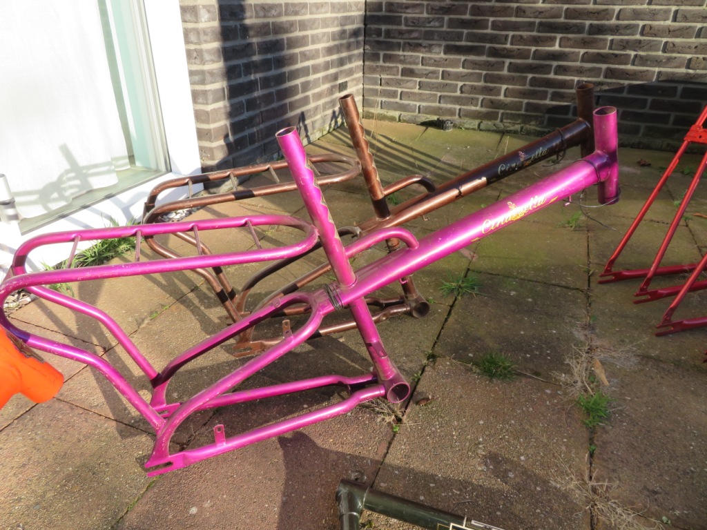 In totaal zijn het 8 frames, zonder voorvorken. Een jongens racefietsje, een Rivette groeifiets met een sticker in Franse stijl want waarom ook niet, enkele Cinderella gezinfietsen met 'optilbeugel' en nog wat meisjes/dames frames. Unieke frames om te zien en moeilijk om er een hele fiets bij te fantaseren. Gelukkig ligt thuis de folder van Rivel uit 1977 waar ze allemaal in volle glorie in staan: