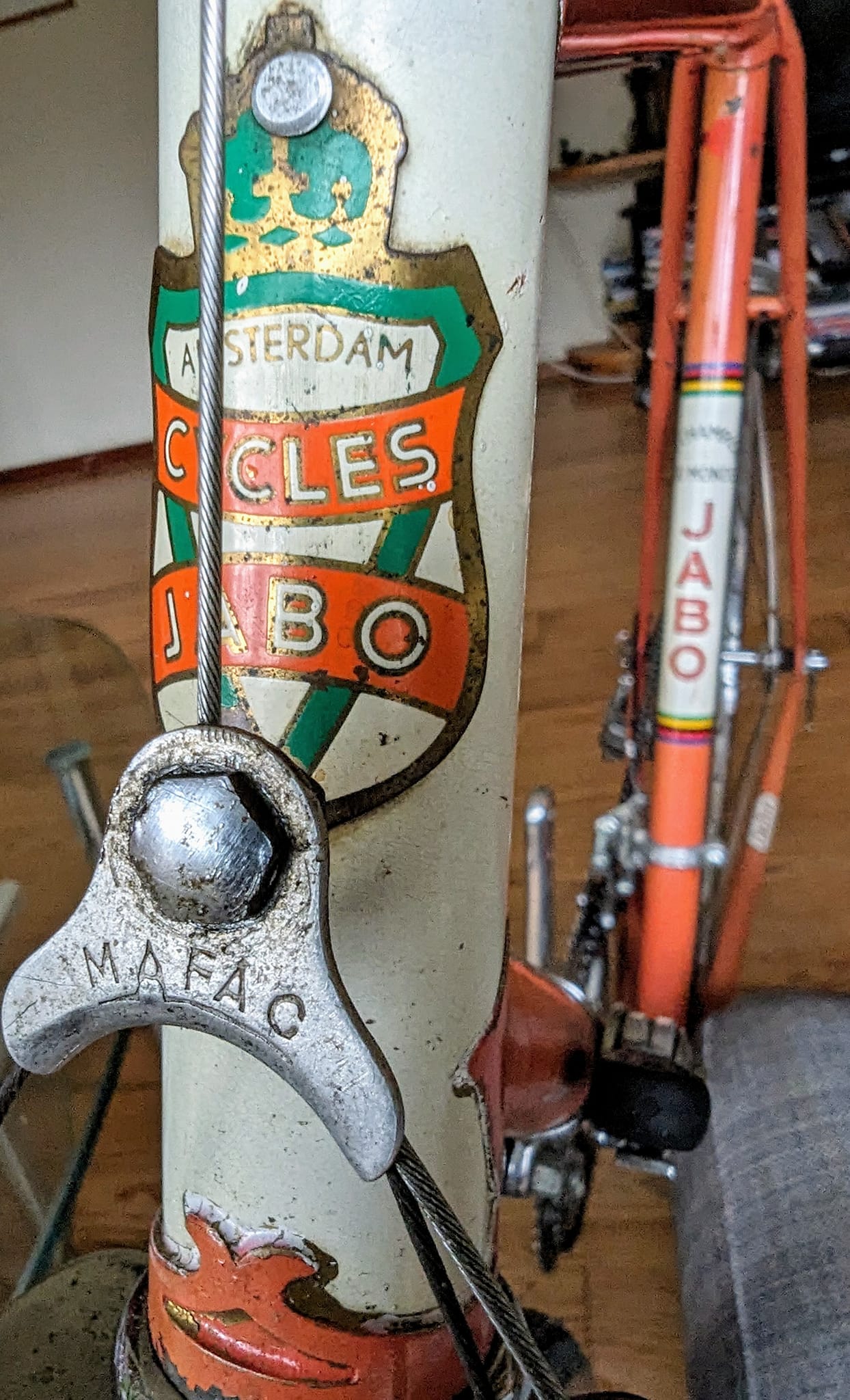 Wie weet welk balhoofdplaatje op deze JABO racefiets hoort en eventueel waar deze nog te koop of te ruil is?