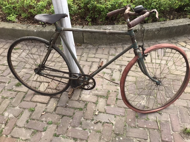 Er heeft zeker een ander stuur opgezeten en die heb ik wel liggen ,moustache-racestuur,maar ik denk door de grijs groene kleur dat die gebruikt is als Legerfiets in de oorlog , zg.beute fiets ,er zijn wel foto,s van dat Duitse soldaten op Franse race fietsen rijden